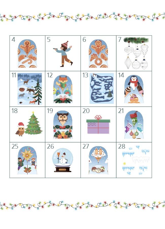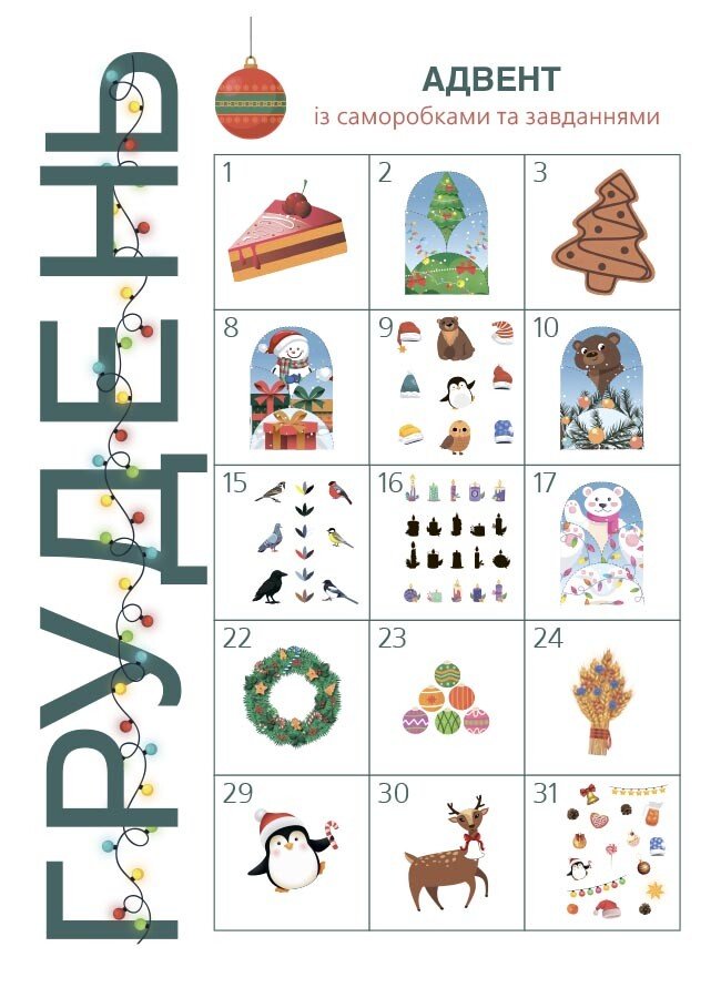 Кожна саморобка перетворюється на конверт, у який потім можна покласти святкову листівку та привітати найрідніших! Наш творчий адвент-зошит допоможе організувати сумісне родинне дозвілля та перетворити очікування свят на справжню зимову пригоду.Розгортайте адвент-зошит та створюйте дива власноруч!