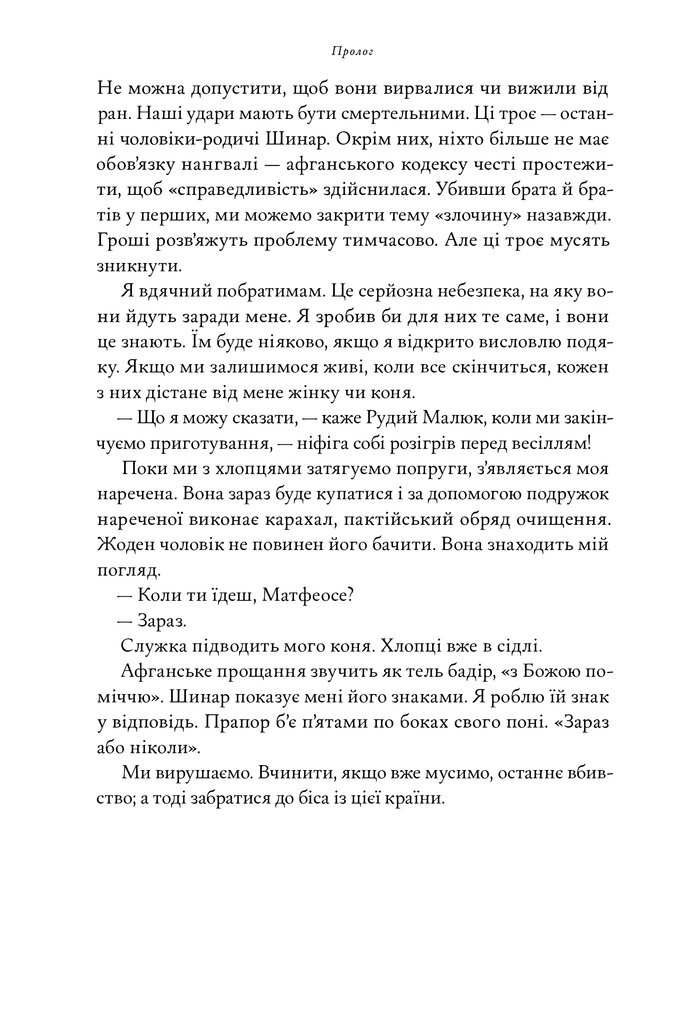 У певний момент приховування звірств заради політичного миру починає гнітити Матфеоса. Та найзапекліша битва відбувається саме в душі героя. Його кохання до афганки Шинар призводить до ганьби її клану, розплата за яку — смерть.
