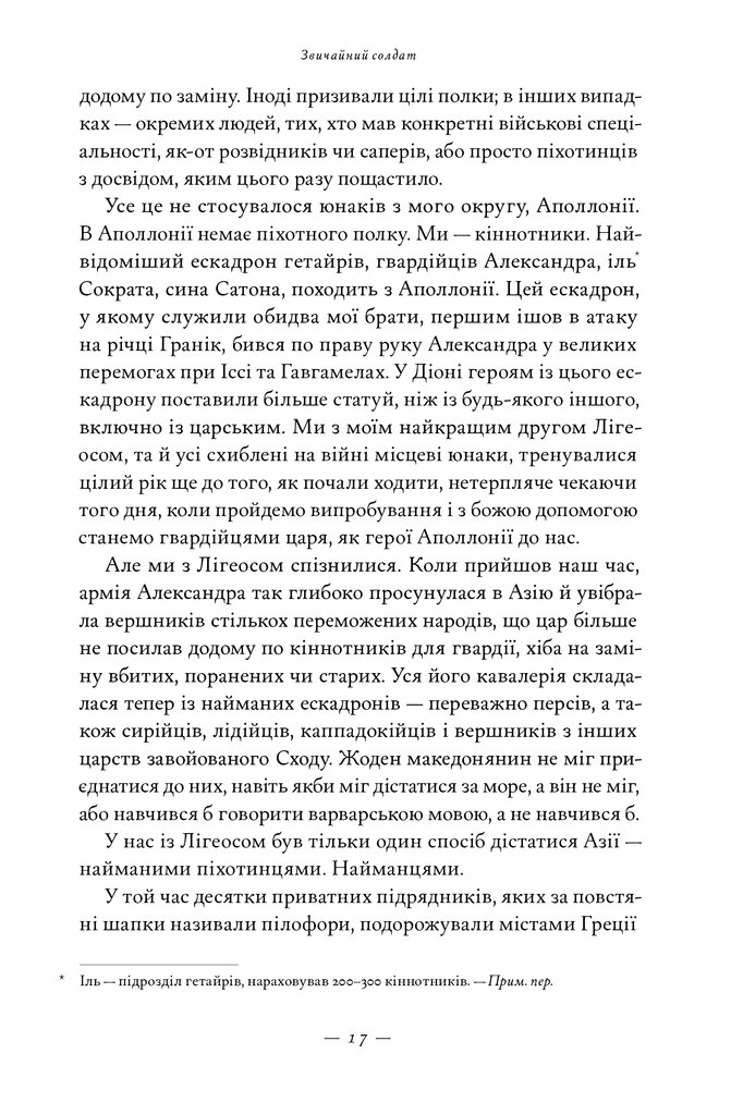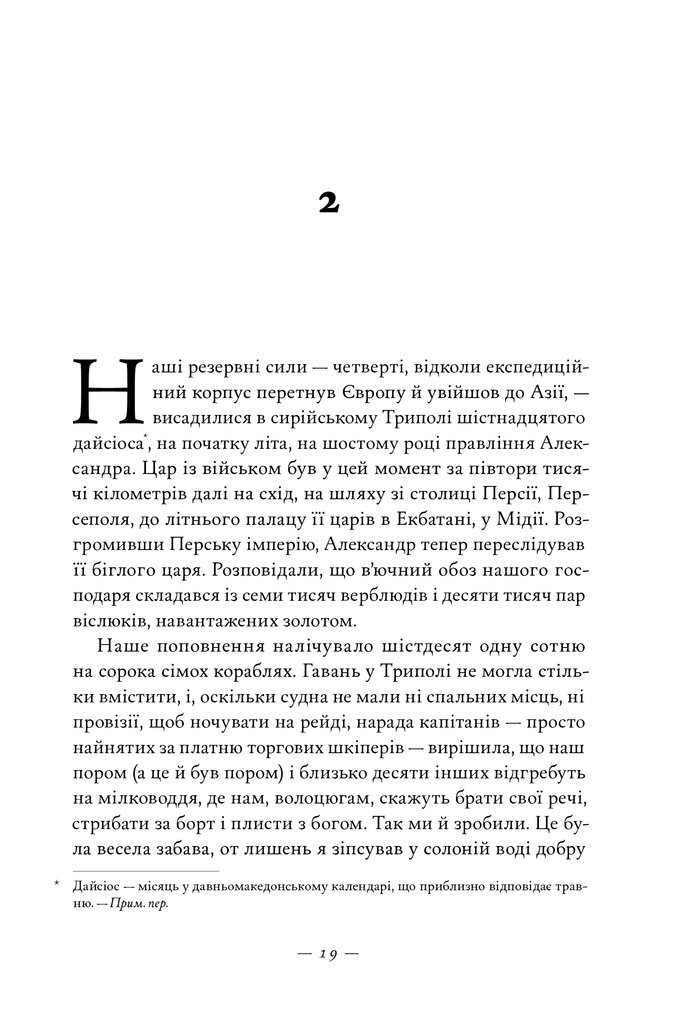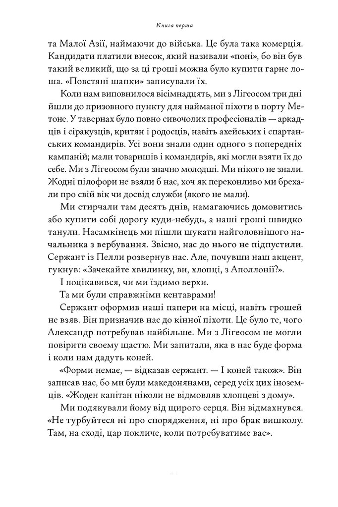 Александр не віддає наказів. Він просто діє. Йде разом з усіма, пішки, зі зброєю та в броні, і жоден новобранець не може за ним устигнути. Він тренується за будь-якої погоди, вдень і вночі. Офіцер, який відзначився, обідає в царському наметі, з великими Кратером і Гефестіоном. В армії Александра немає тілесних покарань. Наш повелитель тримає дисципліну загрозою виключення з корпусу і втратою прихильності, проти яких і смерть не має значення. Один несхвальний погляд Александра обвалить кар’єру найзаслуженішого ветерана, а його усмішка чи прихильне слово прославить наймізернішого.