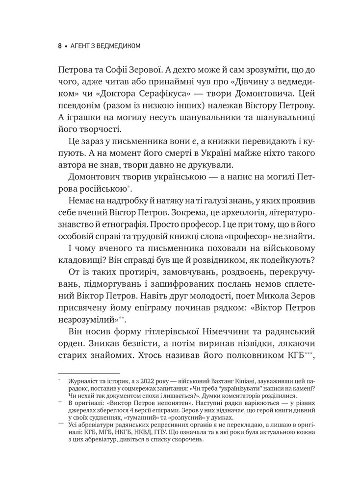 «Агент з ведмедиком» — це книжка, що розкриває подвійну біографію Віктора Петрова (В. Домонтовича): археолога, автора інтелектуальних романів і водночас агента радянських спецслужб. На основі розсекречених архівних справ Служби безпеки України та Служби зовнішньої розвідки автор простежує, як вибудовувалась співпраця агента «Іванова» із органами, якою була його діяльність під час Великого терору та Другої світової, у повоєнній еміграції та після повернення до СРСР.