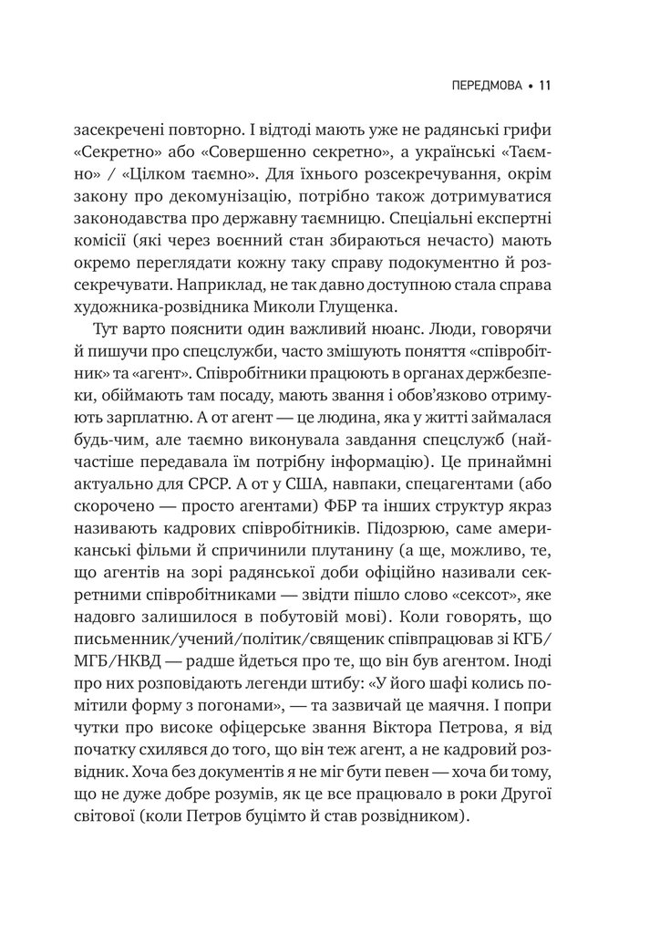 Автор поступово занурює в історію радянського спецагента, окреслюючи його діяння під час еміграції, Другої світової війни та Великого терору. Науковець показує, які зв'язки Петров мав з українською діаспорою та радянським підпіллям, як на ньому позначилися політичні репресії, а також які завдання він виконував під прикриттям.