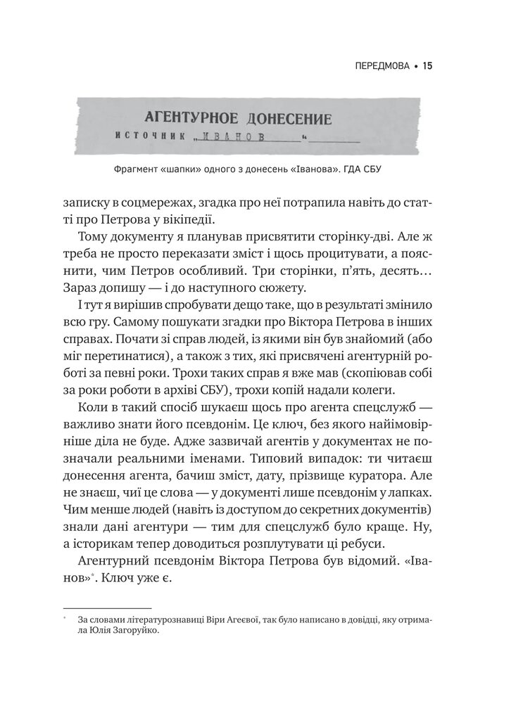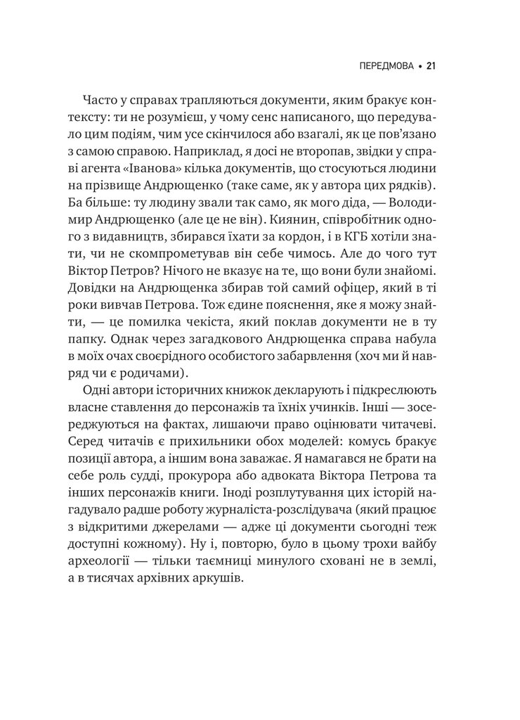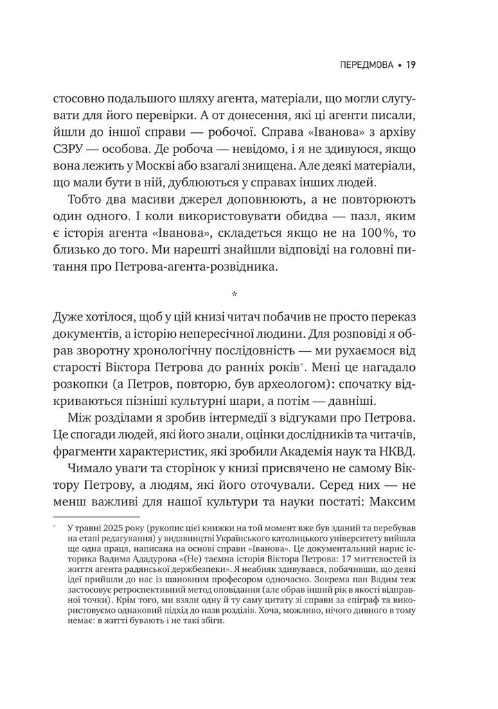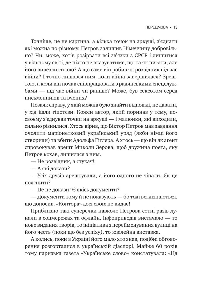 Це книжка про зламані та збережені біографії, про вибір і виживання, про інтелектуальну гру з державою та власною тінню. Автор веде розповідь, як археолог розкопки — від найпізнішого шару до самого дна, відкриваючи не лише подвійну гру Віктора Петрова, а й долі його сучасників: Рильського, Багряного, Шевельова, Кримського та інших.