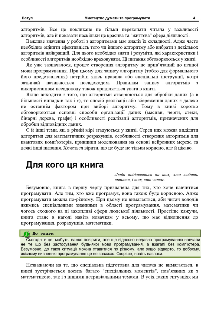 Посібник, який читач тримає в руках, присвячений алгоритмам. У ньому розглядається широке коло тем, так чи інакше пов’язаних з програмуванням і аналізом даних. Зокрема, розповідається, що таке алгоритми й навіщо вони потрібні, наводяться правила алгоритмічного псевдокоду, обговорюються підходи щодо аналізу складності алгоритмів. Крім цього, аналізуються такі типи даних, як масиви, списки, дерева та графи. Приділяється увага обчислювальним задачам. Окремі розділи книги присвячені нейронним мережам та квантовим обчисленням. Також книга містить додаток з прикладами програмних кодів мовою Python, в яких реалізуються алгоритми з книги.