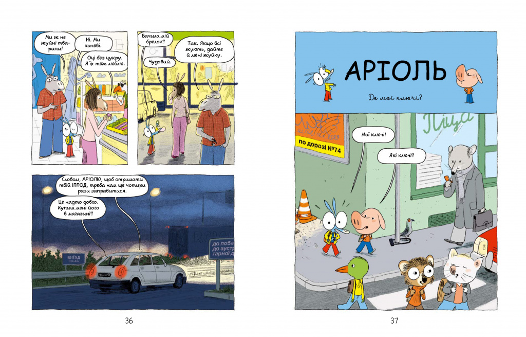 АРІОЛЬ — звичайний маленький ослик в окулярах. Він мешкає у передмісті з мамою й татом. Його найкращий друг — порося РАМОНО. А ще він закоханий у свою однокласницю-теличку. Його класний керівник — великий пес, а фізкультурник — кремезний півень.