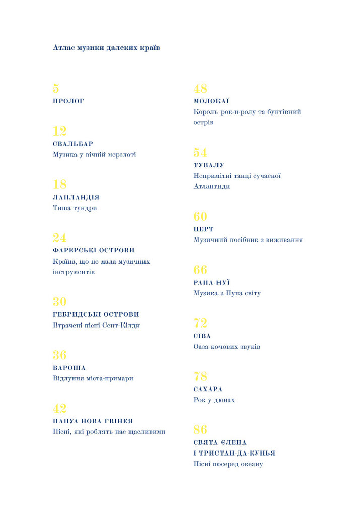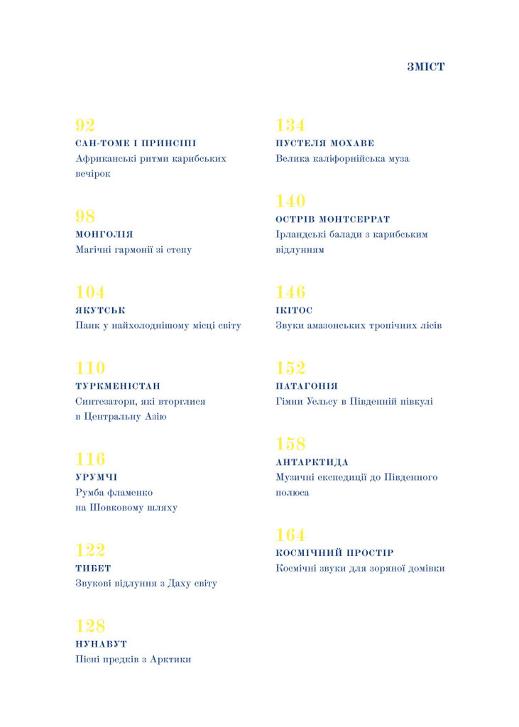 Існують мелодії, що мають особливе географічне звучання. Ландшафт, клімат, обряди та звичаї залишають свій слід у піснях. Ця книжка — захоплива подорож у пошуках тих далеких екзотичних або навдивовижу знайомих звуків музики, здатних нас зворушити. Історії, ілюстрації, карти та цікаві факти запрошують нас прислухатися до звучання невідомих краєвидів, послуговуючись також QR-кодом.