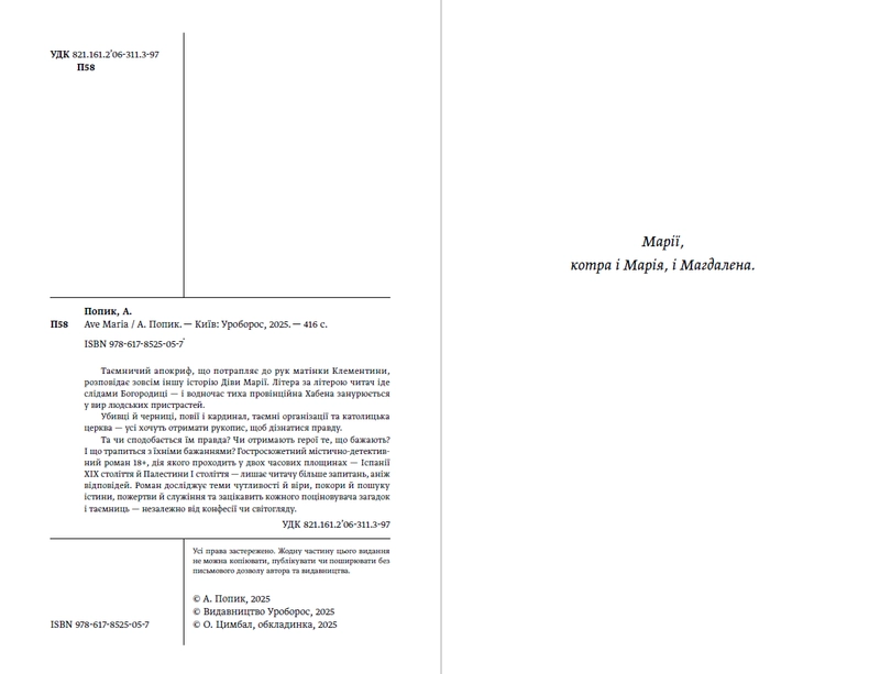 Таємничий апокриф, що потрапляє до рук матінки Клементини, розповідає зовсім іншу історію Діви Марії. Літера за літерою читач іде слідами Богородиці — і водночас тиха провінційна Хабена занурюється у вир людських пристрастей.