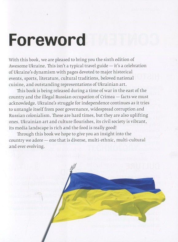 Унікальне англомовне видання про Україну – Awesome Ukraine. Довідник цікавий усім, кому бракувало цікавої і оригінальної інформації про Україну англійською мовою, кому доводилося самотужки пояснювати іноземним гостям чому наша символіка – синьо-жовтий прапор і тризуб, чому українці мають сентимент до соловейка, калини і сала, чому ми горді за Пилипа Орлика, Сержа Лифаря, братів Кличків і літак АН-225 «Мрія», чому фестиваль Казантип впродовж років приваблює молодь, а центр Європи знаходиться в Закарпатській області.