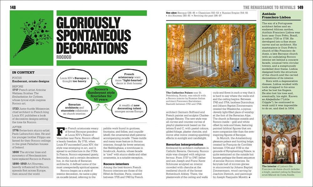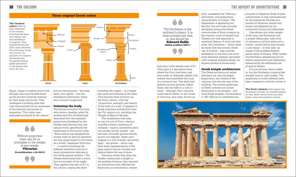 From ancient and classical architecture through Medieval, Gothic, and Renaissance buildings, the explosion of Baroque and Rococo, and the 19th-century «battle of the styles», to the emergence of modernism, postmodernism, and the glittering skyscrapers of the 20th and 21st centuries, the book traces the evolution of construction. Using stunning infographics and mind-maps, it shows how architects throughout history have pushed boundaries and created innovative buildings. Examples of architectural movements and styles are drawn from all over the world and celebrated buildings from Europe and North and South America feature alongside key examples from China, Japan, and India, and stunning religious structures from mosques to churches, and from stupas to pagodas and temples.