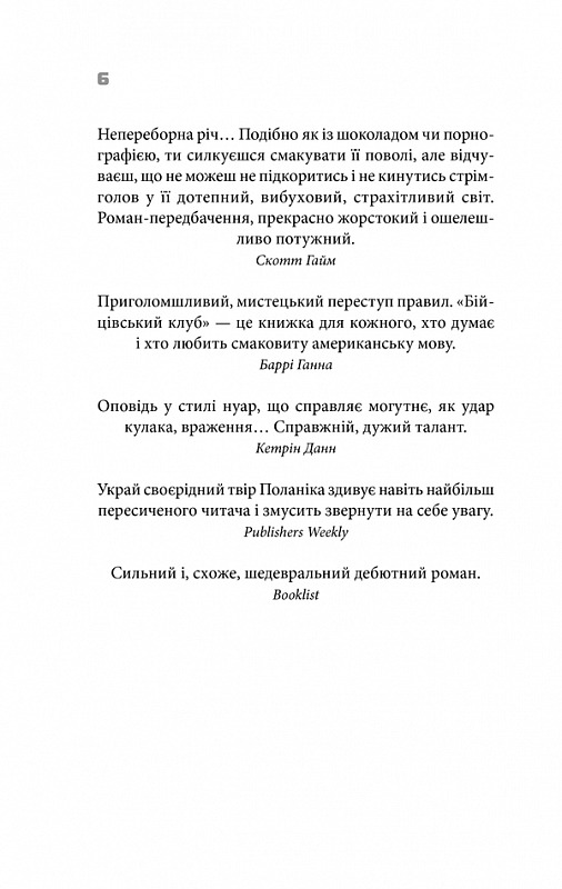 Чака Поланіка називають "шоковим письменником". Нащадок українського емігранта, він розпочав літературну кар’єру в досить зрілому віці, уже маючи, що сказати читачам. Його книжки давно сягнули за межі власне художнього твору і стали явищем контркультури. Стиль Поланіка - різкий, категоричний, провокативний - це маніфест покоління Х. Твори письменника здобули нагороди Pacific Northwest Booksellers Association Award і Oregon Book Award, а також кілька разів номінувалися на Премію Брема Стокера.