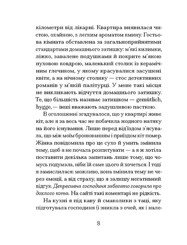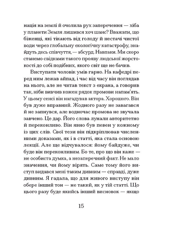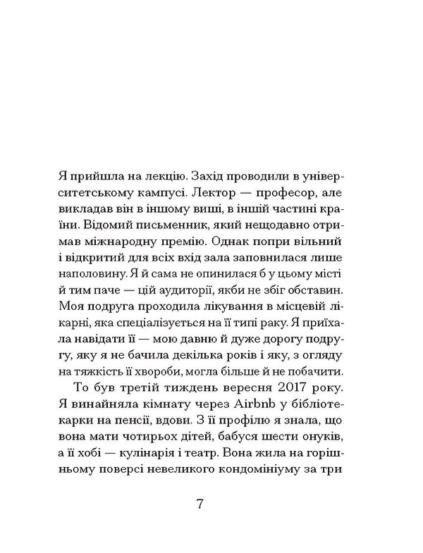 У звичному перебігу життя героїня зустрічає різних людей: колишнього, який переконує, що кінець світу не за горами, власницю житла на Airbnb, яка не вміє спілкуватися з гостями, незнайомця, що просить допомогти розважити його стареньку матір, подругу юності, яка бореться з невиліковною хворобою. Їх усіх об’єднує спільна потреба — розповісти про себе, знайти того, хто почує їхні історії. Вона сприймає цей хор голосів як пасивна слухачка, аж доки не лунає незвичайне прохання. З нього й починається глибока історія — історія, яка повністю трансформує саму героїню.