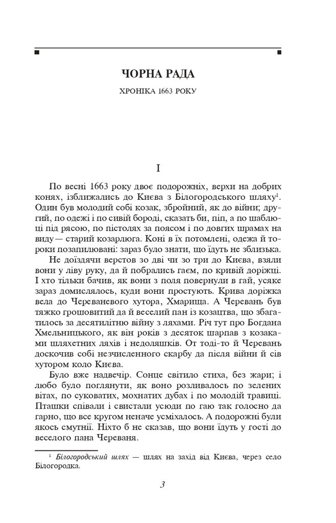 «Чорна рада. Хроніка 1663 року» — перший в українській літературі історичний роман-хроніка, в якому зображено період розпаду України фактично на дві частини — Правобережну і Лівобережну. Остаточний розкол країни закріпила Чорна рада, яка відбулася у червні 1663 року в Ніжині і знаменувала початок занепаду Гетьманщини. Після смерті Богдана Хмельницького почалася запекла боротьба за гетьманську булаву.