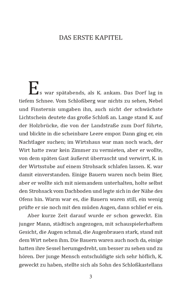Der philosophische Roman Das Schlo von Franz Kafka (1883–1924) wurde nicht vollendet und erst nach dem Tod des Autors verffentlicht. Die Handlung der Arbeit ist absurd, aber gleichzeitig glaubwrdig. Und die Satire auf das brokratische System ist nur einer der Subtexte des Romans.