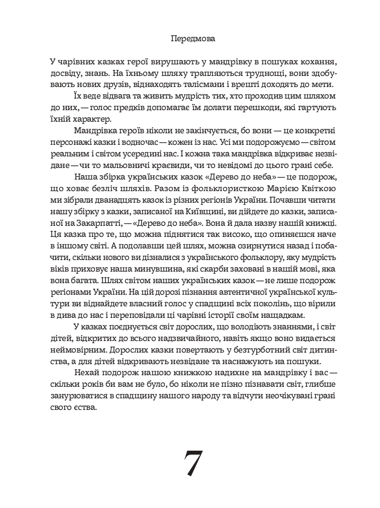 Для нашої збірки українських народних казок «Дерево до неба» фольклористка Марія Квітка зібрала дванадцять казок із різних регіонів України. Це уявна мандрівка нашою країною, у якій ви відкриєте багатство автентичної народної спадщини та красу української мови з її діалект ними особливостями. Історії, зібрані тут, стануть відправною точкою для занурення в мудрість віків і пошук власного унікального голосу, щоб краще розуміти, хто ми і звідки.