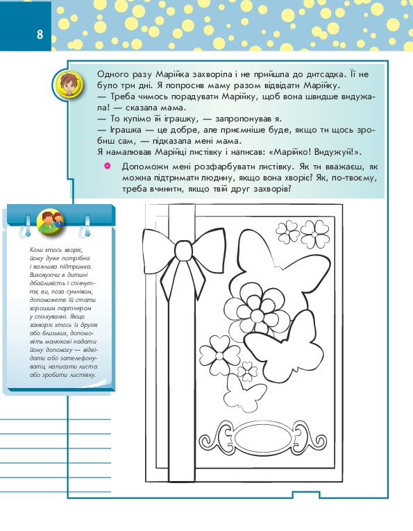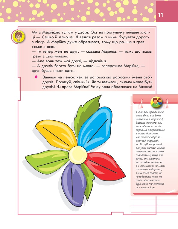 Ми навчаємо дітей читати, писати і лічити. Чом би не навчити їх спілкуватися, дружити, прощати? Ця книга — надійна помічниця в такій важливій справі, як навчання спілкування. Друзі Мишко і Марійка допоможуть дитині стати товариською, навчать її знайомитися, розкажуть про те, хто такий справжній друг і як дружити так, щоб не сваритися. Прості й веселі завдання будуть цікаві і зрозумілі дитині, а дорослим допоможуть вчасно відповісти на запитання, що виникають, і краще пізнати свого малюка.