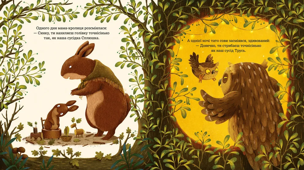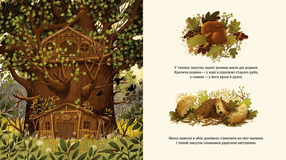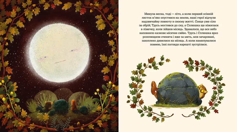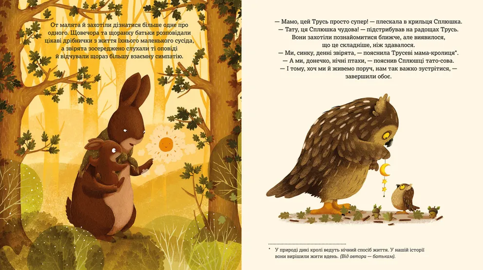 У підніжжі старого дуба живе кроляча родина, а високо в його кроні, у дуплі-сховку — совина. І хоча кролі й сови мешкають поруч, зустрітися їм непросто. Адже коли сонячного дня кроленя Трусь стрибає серед трав, маленька сова Сплюшка солодко спить. А коли вона випростує крила, щоб політати у сяйві місяця, Трусь якраз засинає. Минають дні та ночі, а малята майже нічого не знають одне про одного. Аж до миті, коли вперше побачаться