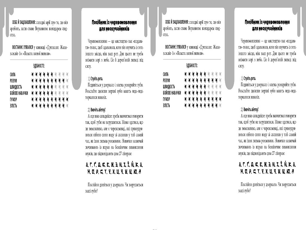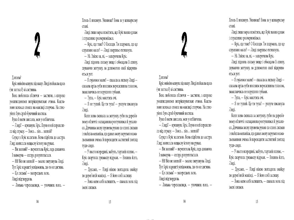 ...Близнючки Лінді і Кріс знаходять на звалищі черевомовницьку ляльку. Лінді «рятує» її, бере собі й називає Ляскалом. Але Кріс шаленіє від заздрощів. Так нечесно! Чому всі радощі-веселощі і вся увага завжди дістаються Лінді? Кріс вирішує завести ляльку й собі. Вона покаже цій Лінді! Аж тут починає коїтися щось дивне. Мерзенне. Моторошне. Не може бути, щоб усе це чинила якась дерев’яна лялька! Чи, може, може?..