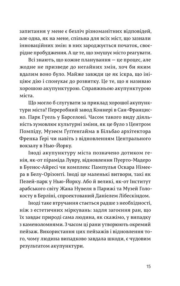Автор пояснює урбаністичну теорію «акупунктури міста» на прикладі багатьох країн; дотепно, зворушливо і поетично розповідає, як незначні заходи, що нагадують китайську медичну практику голковколювання, здатні призвести до величезних позитивних змін і зробити цей світ кращим.