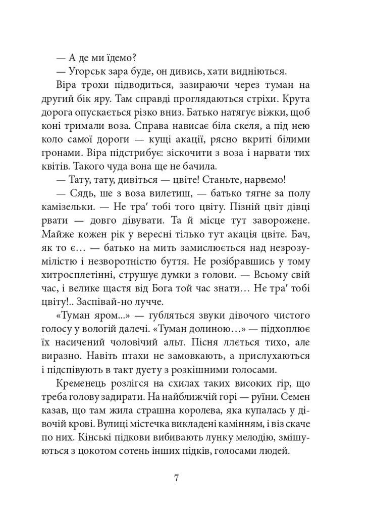 Ця книга — історія кохання й становлення особистості дівчини, яка волею долі опинилася на лезі жорсткого протистояння ідеологій, націй, світів. Персонажі цілком реально сприймаються у вирі подій, що відбувалися на Тернопільщині впродовж найтрагічнішого десятиліття (1939–49), яке перекраяло не лише сім’ї, території, а й світогляди. Чорні жорна історії перетирали людей нещадно, та людяності знищити не змогли Роман безумовно — любовний, але й соціальний, але й історичний, але й психологічний Для широкого кола читачів.