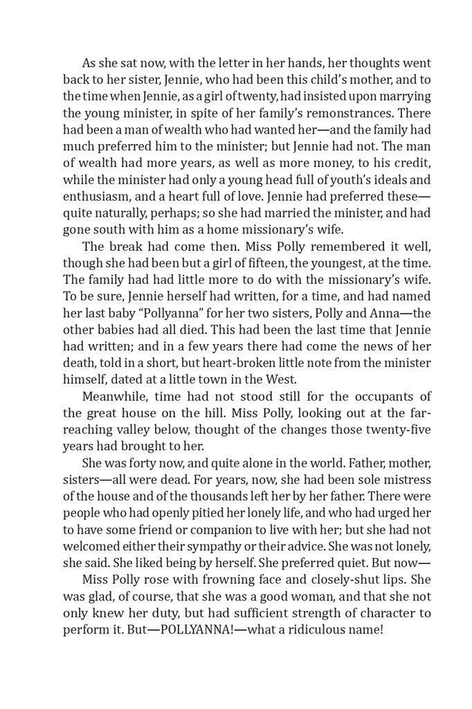 «Pollyanna» is a novel by the American writer Eleanor Porter (1868–1920). An orphan girl who knows how to see something joyful even in the saddest, moves in with her rich aunt and completely changes her life, as well as the lives of all the inhabitants of the city.