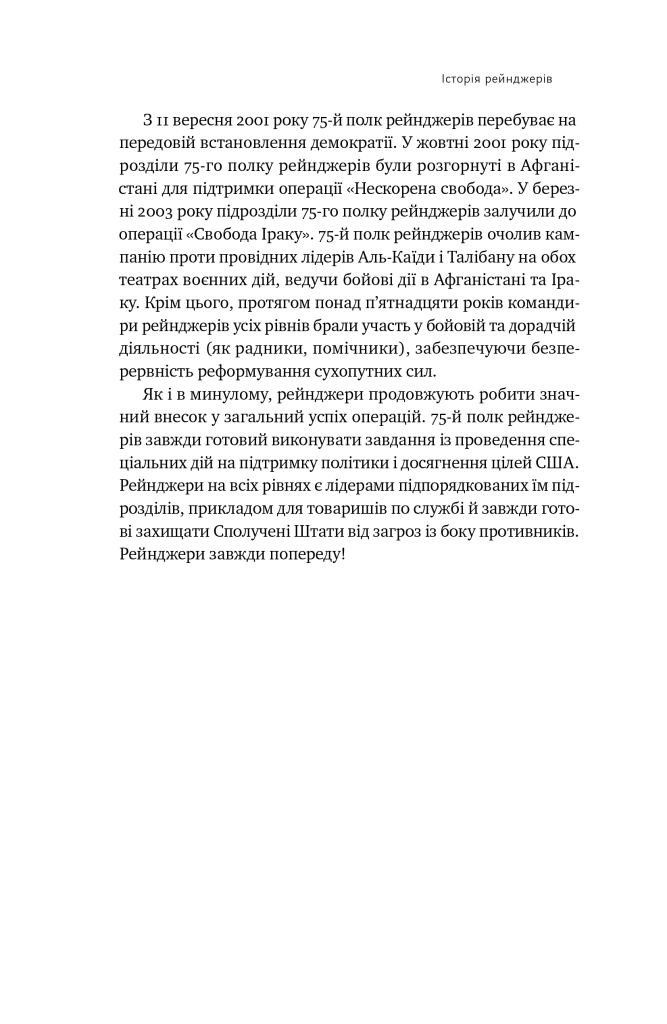 "Посібник рейнджера. Не для слабких чи легкодухих" призначений для високопрофесійних піхотинців, що спеціалізуються на складних і небезпечних місіях, десантних рейдах, захопленні летовищ, знищенні особового складу та техніки в тилу ворога. Ця легендарна книга описує прийоми й тактики, за допомогою яких солдати стають найкращими у своїй справі. Зокрема, у виданні йдеться про введення ворога в оману, винахідливість, скритність, зв’язок, відступ та ухилення, засідки, захист периметра, контррозвідку та багато іншого.