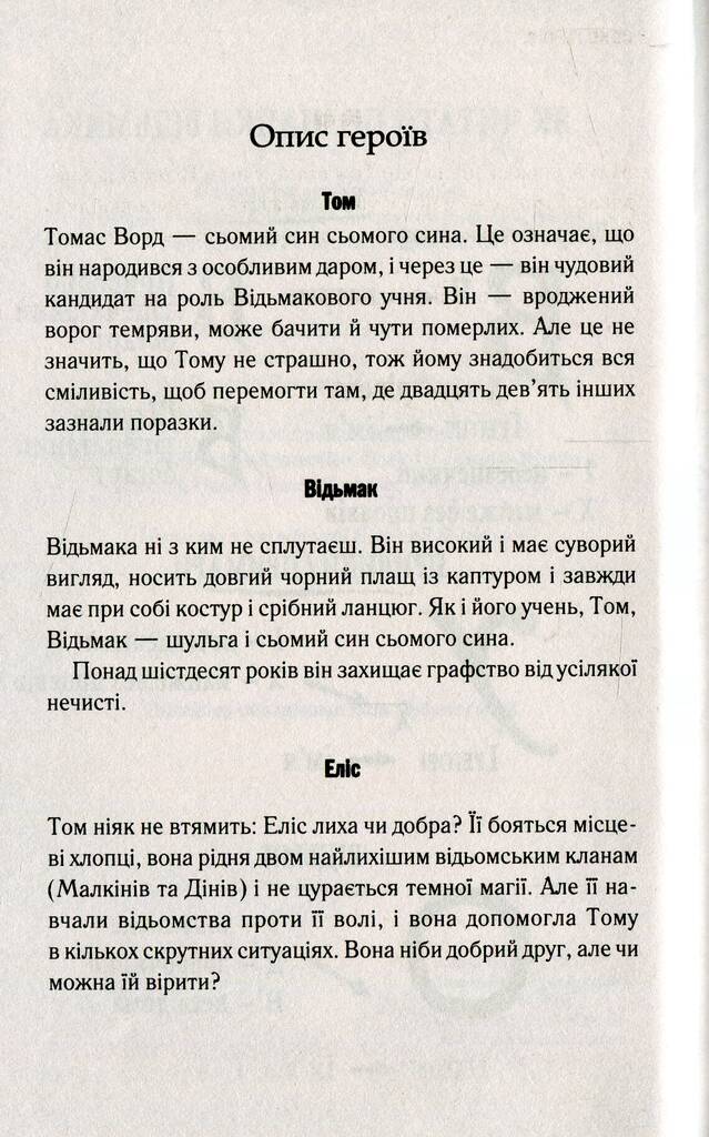 Мене звуть Том. І я —сьомий син сьомого сина. Мої батьки віддали мене в учні до справжнього Відьмака. Я так само мушу оволодіти цим ремеслом. Більшість учнів Відьмака були занадто ліниві та неслухняні. Вони не змогли завершити навчання. Дехто навіть загинув Але я — сьомий син сьомого сина. Я можу бачити привидів. І мені судилося захищати цей світ від потойбічних створінь. Ну якщо я, звісно, подолаю всі ці тренувальні випробування і не накою дурниць Це наче нескладно. Головне, що заповів мені Відьмак, — не розмовляти з дівчатами в гостроносих туфлях. Бо дівчата в такому взутті — найнебезпечніші та найжорстокіші відьми у світі. Саме одна з них тільки-но врятувала мене від бешкетників. Як же я міг не заговорити з нею? До речі, її ім’я Аліса. І, здається, я втрапив у серйозну халепу