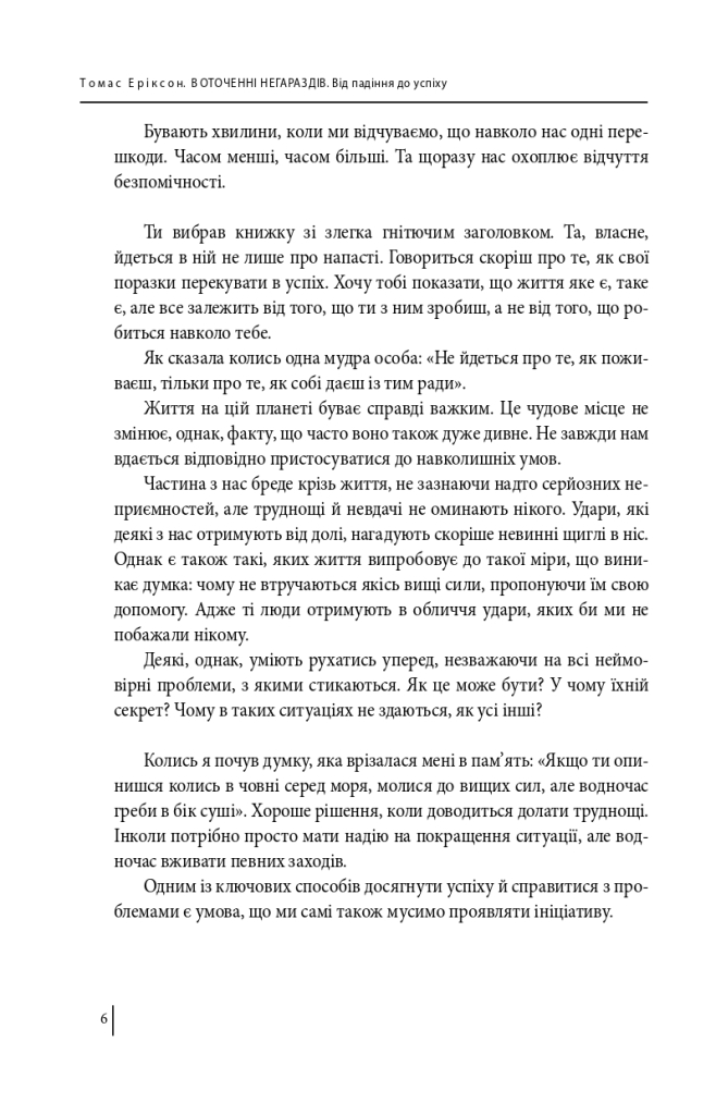 Шведський журналіст і письменник, психолог із соціальнихкомунікацій Томас Еріксон (нар. 1965) допоможе вам перетворити негаразди на успіх за допомогою поведінковоїмоделі зі свого бестселеру «В оточенні ідіотів». Нагадавши, що життя таке, як воно є, Еріксон допомагає вам зрозуміти, що насправді марно намагатися контролювати все, щовідбувається навколо вас. Замість того, щоб нарікати, коли життя підкидає вам перешкоди, зосередьтеся на тому, як з ними впоратися. Книга «В оточенні негараздів» допоможе вам знайти метод, який підходить саме вам, і в рівній мірірозважить та надасть вам сил.