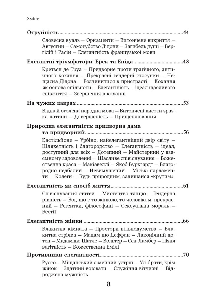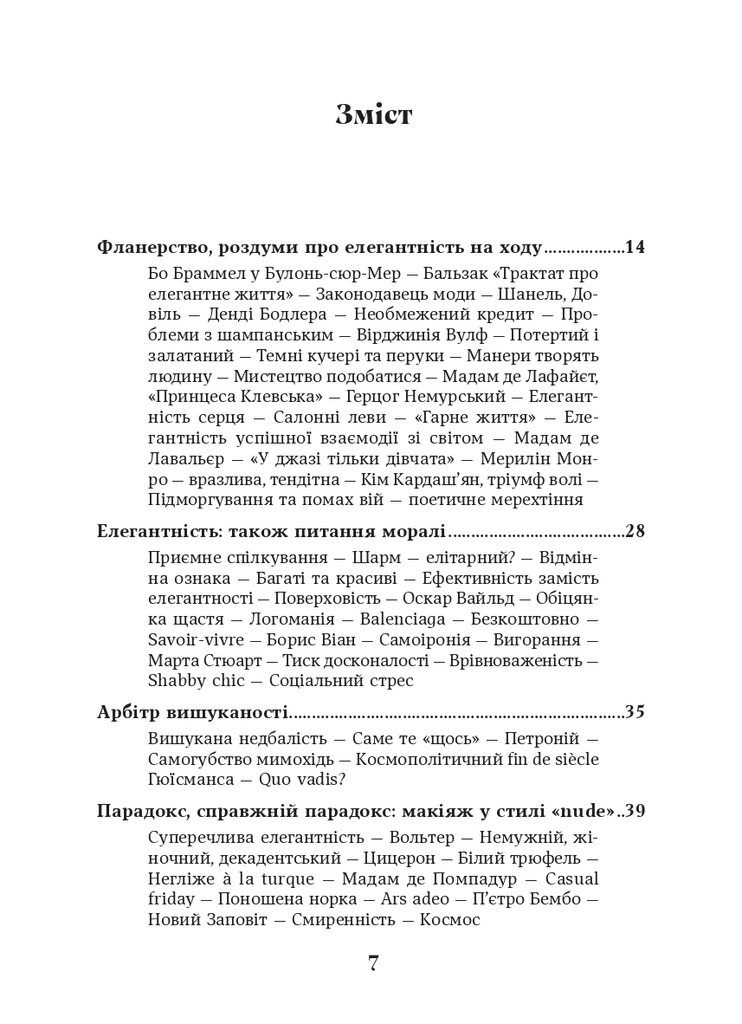 Книжка Барбари Фінкен «Елегантність» – роздум про невловиму сутність витонченості, що пронизує саму тканину існування. Авторка, немов досвідчений фланер, веде нас крізь лабіринти історії та культури, розкриваючи численні грані елегантності: від манер, що творять людину, до мистецтва подобатися та здатності до безтурботного співжиття. Перед нами постає галерея образів – від арбітра вишуканості Петронія до авангардного модельєра Йодзі Ямамото. Замальовки Фінкен є не лише екскурсом в історію моди та етикету, а й глибоким філософським дослідженням того, що робить людину істинно привабливою, життєрадісною та здатною знаходити щастя попри життєві негаразди. Фінкен переконливо доводить, що елегантність – зовсім не про показну розкіш, а про внутрішню гармонію, «елегантність серця», що дозволяє нам залишатися привітними та відкритими у світі, де панує прагматизм.