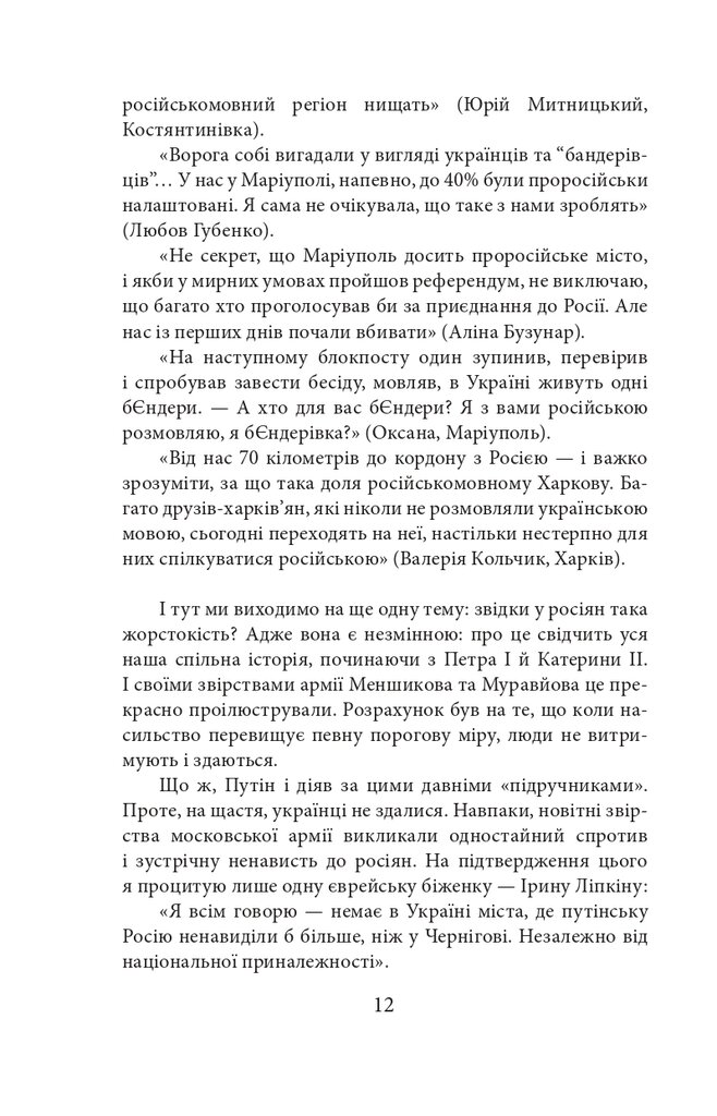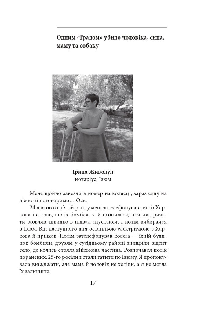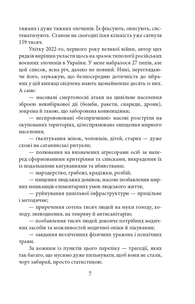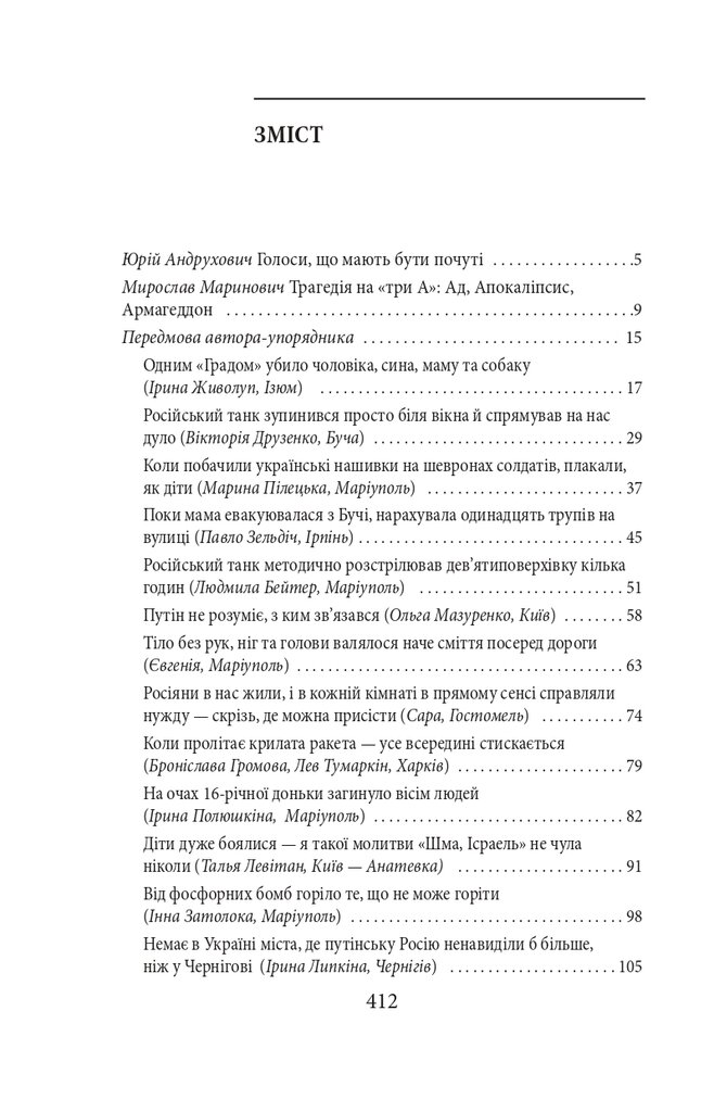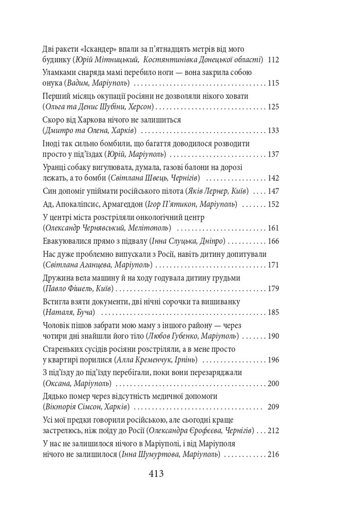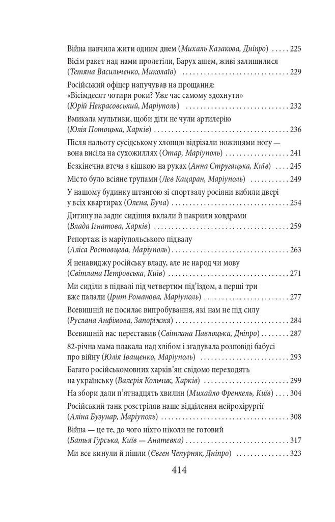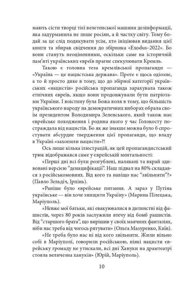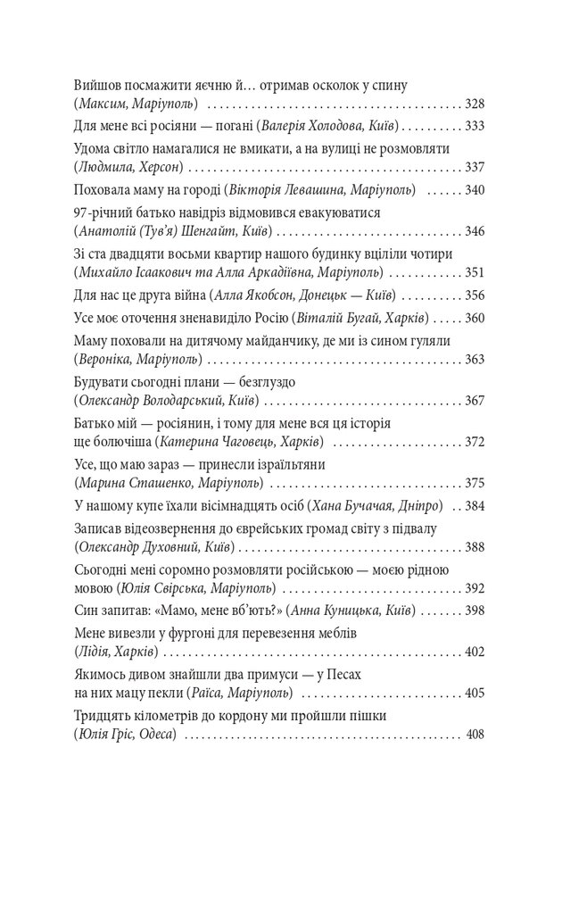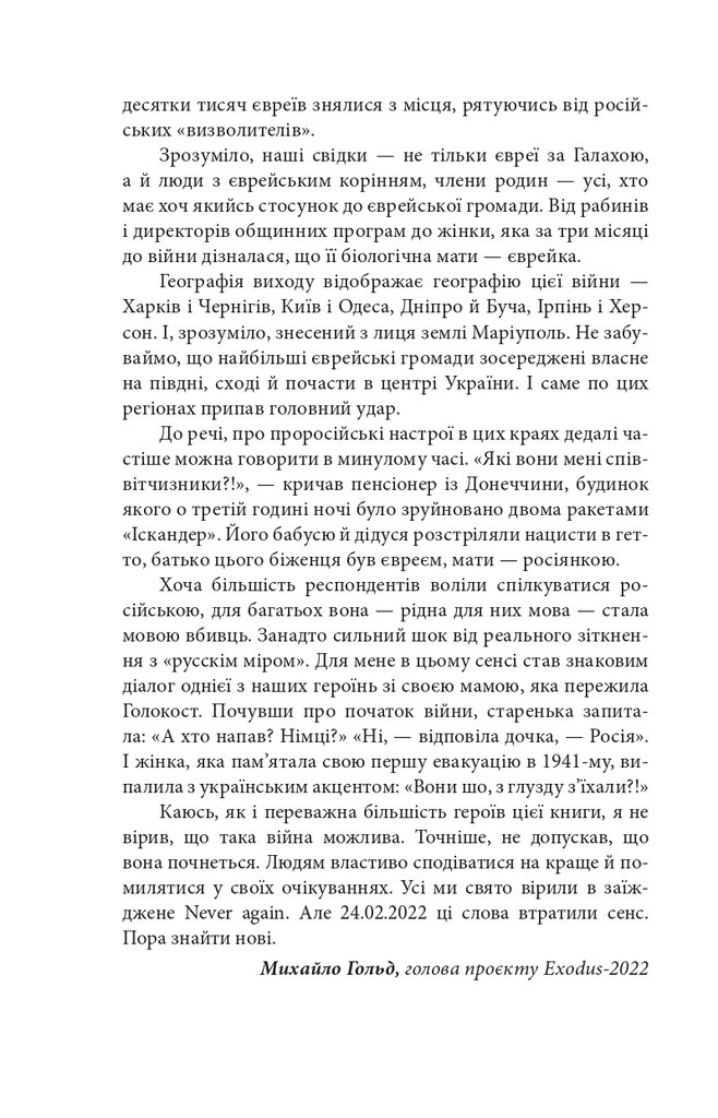 Голова проєкту Exodus-2022 Михайло Гольд зібрав у цій книзі свідчення, які могли б стати частиною обвинувачень на майбутньому трибуналі. Деякі співрозмовники втратили дах над головою, багато хто — роботу й засоби до існування, є серед них важко поранені й ті, хто втратив рідних і близьких. Виживання під артилерійськими обстрілами та бомбардуваннями, у підвалах без електрики, газу, зв’язку, води і їжі, перипетії евакуації, допити у ФСБ — цим людям було про що розповісти.