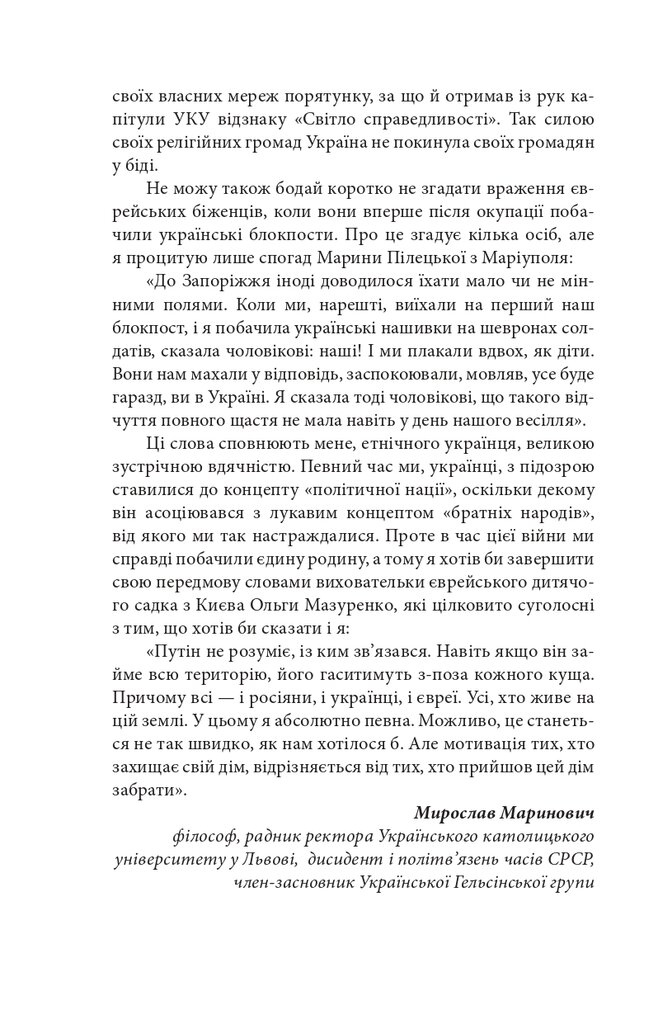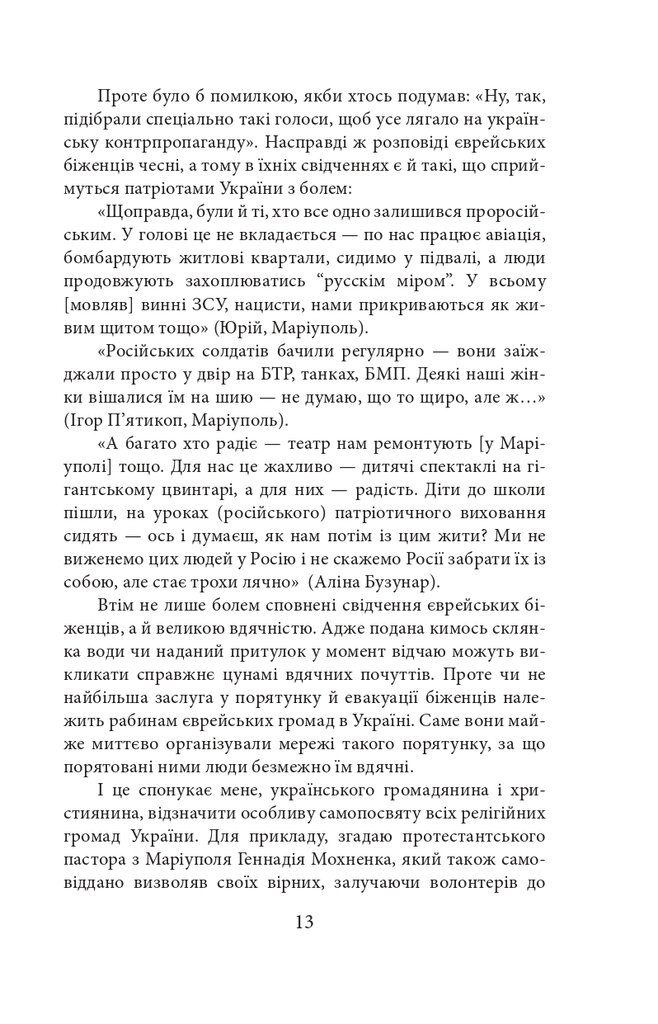 Кров єврейських біженців, зрозуміло, не червоніша за кров інших. Однак офіційною метою російської «спецоперації» було оголошено денацифікацію й захист російськомовного населення. Тому особливо показовими є історії переважно російськомовних євреїв України, чиї життя були зруйновані «визволителями від нацизму». Ці люди стали об’єктами подвійної «турботи» Кремля — і як євреї (для яких нацизм — еквівалент абсолютного Зла), і як російськомовні.