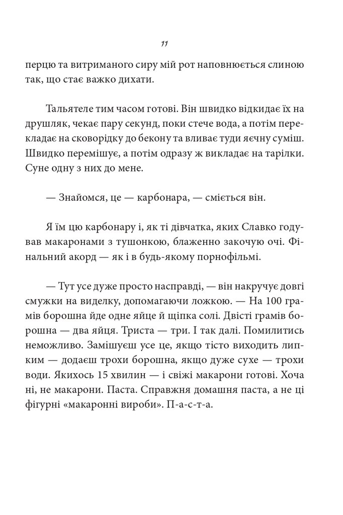 «Фудпорно» — це іронічна збірка кулінарних рецептів, поданих у форматі сторітелінгу. У кожне з двадцяти коротких оповідань, що нерозривно пов’язані з їжею, авторка «зашиває» покроковий рецепт приготування страви й душевні історії з власного життя — подекуди смішні, подекуди ностальгічні, а подекуди відверто еротичні.