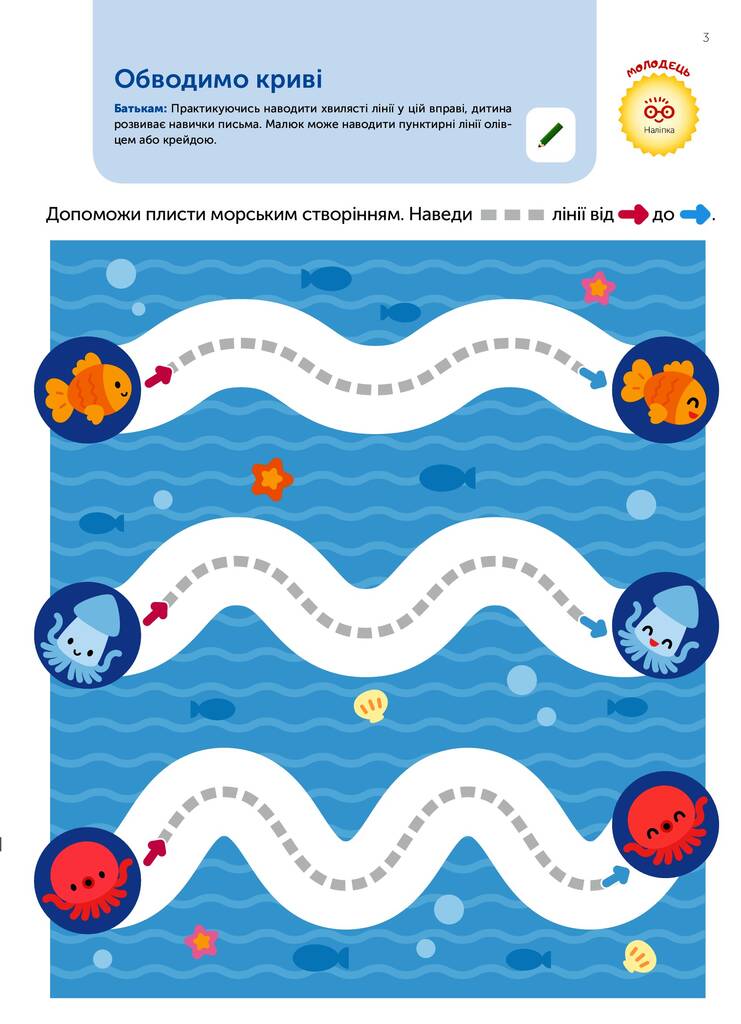 Ця книжка допоможе вашому малюку розвинути такі потрібні для дошкільної освіти навички, як-от виконання вказівок та завдань, і набути водночас таких практичних умінь, як порівняння і розподілення, пошук відповідностей, співвіднесення частин і цілого, визначення, де більше, де менше, вибір кольору і фарбування, вміння думати наперед і вирішувати проблему.