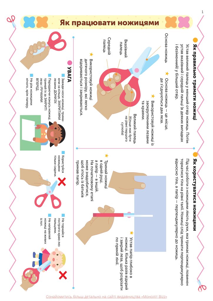 Виконуючи веселі вправи, з яких складається книжка, малюк бавитиметься і водночас вчитиметься правильно тримати ножиці, клей-олівець та маніпулювати ними.