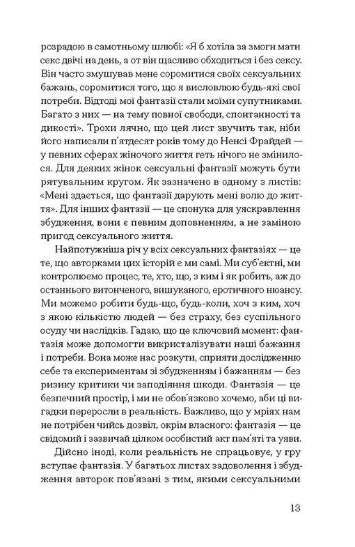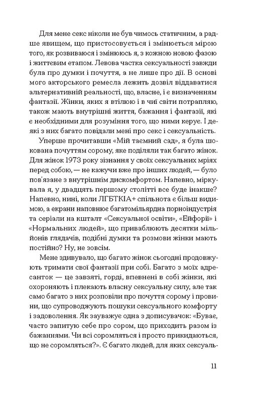 Говорячи про секс, ми говоримо про жіночність і материнство, зраду та експлуатацію, згоду та повагу, справедливість і рівність, кохання та ненависть, насолоду та біль. І все ж таки з багатьох причин — складних чи ні — так багато з нас про це не говорять. Наші найглибші, найінтимніші страхи й фантазії залишаються замкненими всередині, поки хтось не принесе ключа.