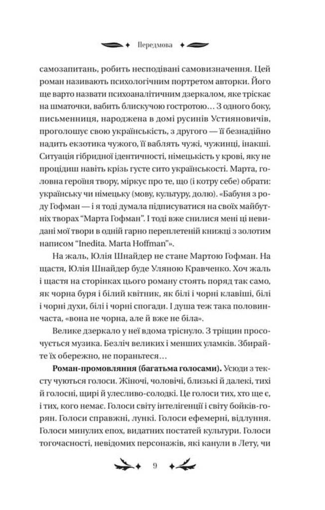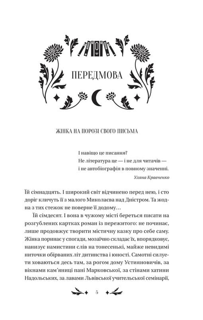 Уляна Кравченко аналізує минуле й реальність із феміністичної перспективи: як було зростати талановитій дівчині в традиційній патріархальній атмосфері. Письменниця оприявнює мотиви і обставини її вибору — бути українською письменницею. Розповідаючи про себе і своє дорослішання, авторка завжди тримає дистанцію, адже це не документальна біографія, а художній твір.