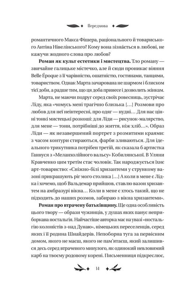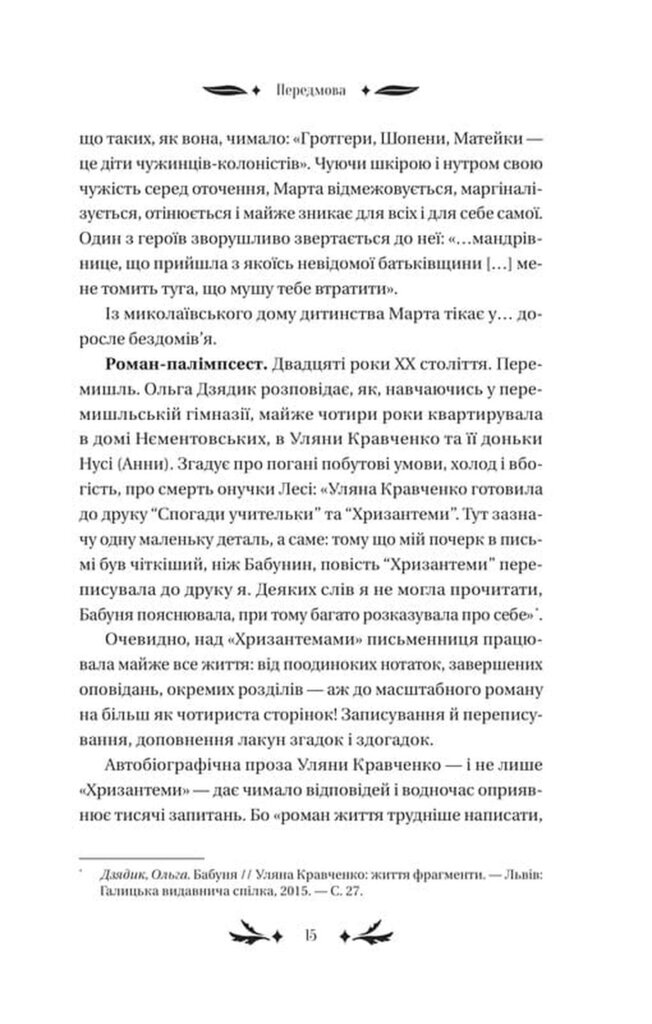 У скарбниці української художньої літератури «Хризантеми» Уляни Кравченко — це особливий роман, в якому міцно переплетено елементи сповіді, психологічні замальовки, спостереження та філософські роздуми про власний життєвий шлях. Уже доросла авторка озирається на свою юність у галицькому містечку, накладаючи на спогади наратив про дорослішання. У творі Уляни Кравченко постає картина життя на Галичині тих років: виринають із минулого модні забаганки далекої епохи, традиції бойків, літературні віяння, під впливом яких формувалася письменниця. Та найцікавіше у цій книзі пам’яті — лірична героїня, сама авторка, чия особистість поступово розкривається, ніби вишукана квітка, хризантема...