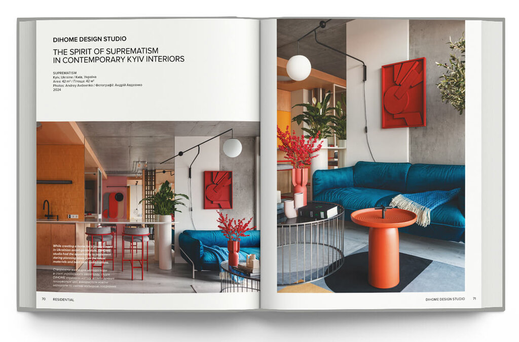 Книга Interior Design розповідає про проєкти дизайну інтер’єрів комерційної та житлової нерухомості, які було реалізовано та/або введено в експлуатацію під час повномасштабної війни в Україні з 2022 до 2024 року. До видання увійшли об’єкти від 34 українських дизайнерів і студій. Публікація розповідає не просто про сучасні інтер’єри, а передусім про талановитих українців – дизайнерів та архітекторів, які продовжують працювати, творити, реалізовувати власні ідеї та мрії своїх клієнтів навіть у найважчі часи для життя та бізнесу. Ця книга – вже третій випуск із серії про дизайн інтер’єру від видавництва Creative Publishing. Багато професіоналів залишили Україну через повномасштабне вторгнення або шукають нові ринки, тому в цей випуск книги редакція також додала їхні закордонні проєкти, створені під час війни.