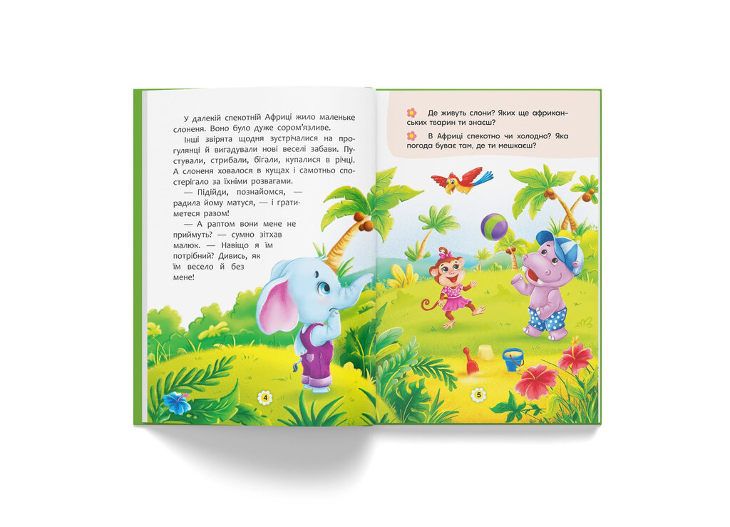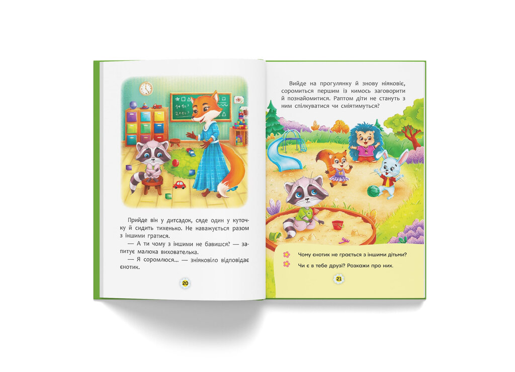 Ця книжка не звичайна, вона повчальна. Ти знайдеш у ній історії про надміру сором'язливих слоненят та енотика, які не могли ні з ким познайомитися й потоваришувати. Проте вони здолали свою ніяковість та знайшли друзів. Хочеш дізнатися як? Відповідь міститься у книжці. Поважно прочитай її, дай відповіді на запитання та дізнайся секрет наших маленьких героїв. А щоби зацікавити тобі ще більше, ми пропонуємо виконати захоплюючі завдання.