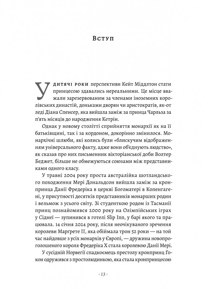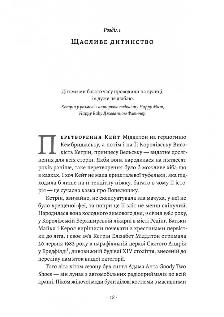 Перетворення Кейт Міддлтон на герцогиню Кембриджську, а потім і на Її Королівську Високість Кетрін, принцесу Вельську — видатне досягнення для всіх сторін. Якби вона народилася на п’ятдесят років раніше, таке перетворення було б можливе хіба що в казках. І хоч Кейт не мала кришталевої туфельки, яка підходила б лише на її тендітну ніжку, багато в чому її історія — це сучасна казка про Попелюшку. Кетрін, звичайно, не експлуатувала зла мачуха, у неї не було хрещеної-феї, та попри це її зліт не менш сліпучий.