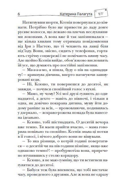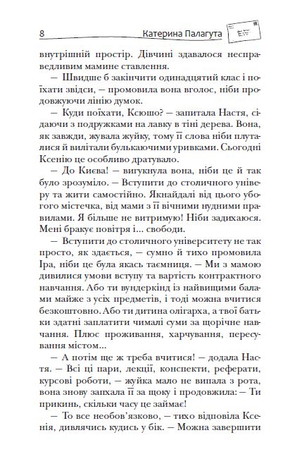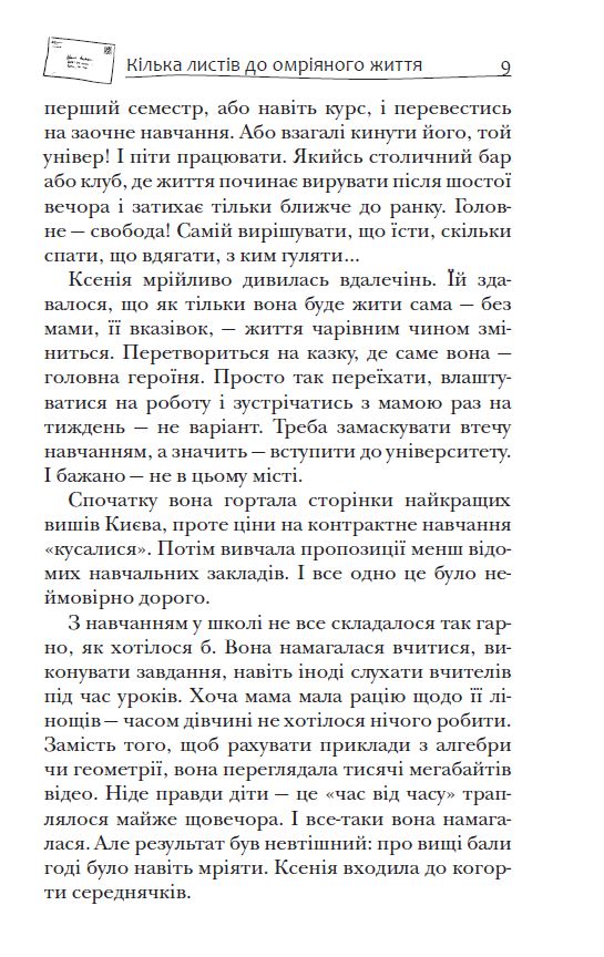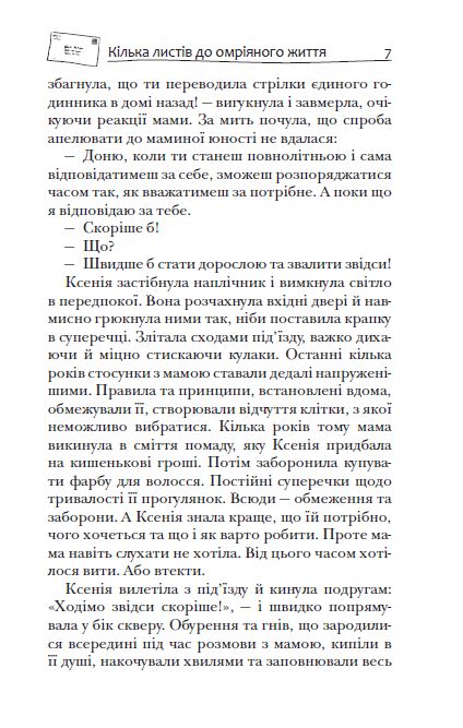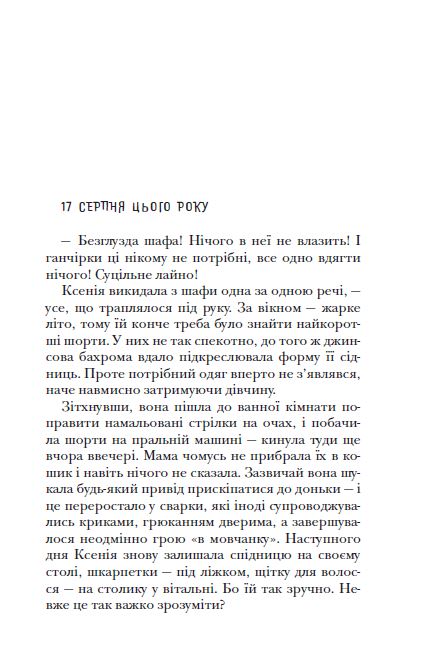 Ця книга — історія про дорослішання, внутрішні пошуки й вибір власного шляху. У центрі сюжету — Ксенія, звичайна дівчина зі звичайного міста, життя якої наповнене не лише власними підлітковими емоціями, а й зрадами та складними стосунками із мамою, а ще дівчина зустрічає своє перше кохання. Ксенія прагне свободи, однак на кожному кроці до своєї мети виникають дедалі складніші запитання: як відрізнити справжнє почуття від простого захоплення, де межа між щирістю та наївністю, і що ж таке справжня самостійність?