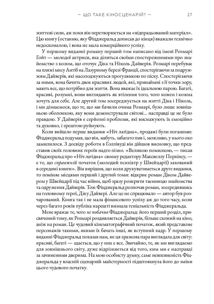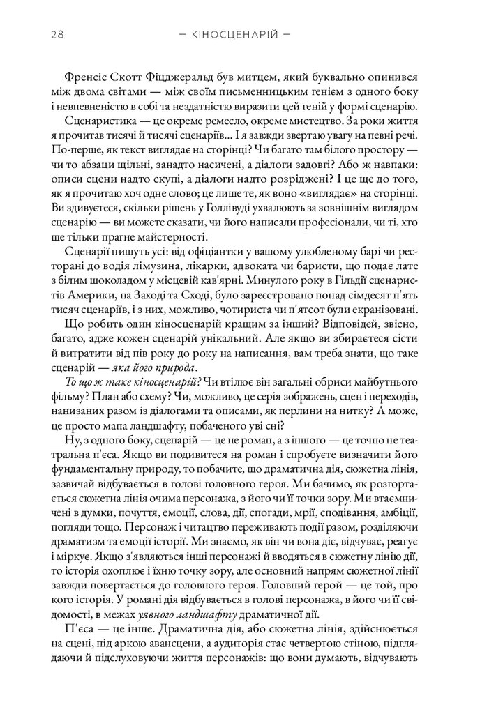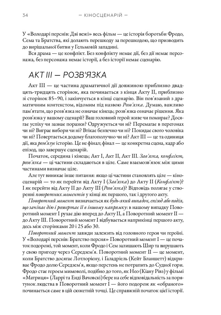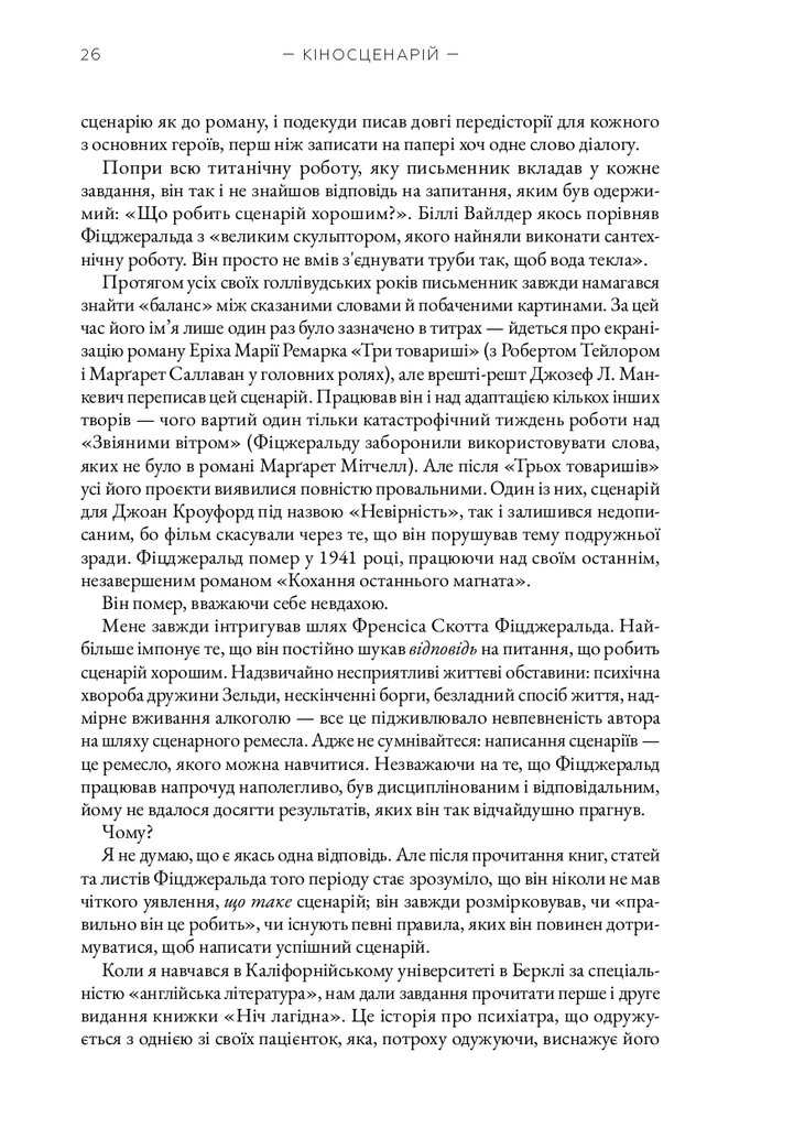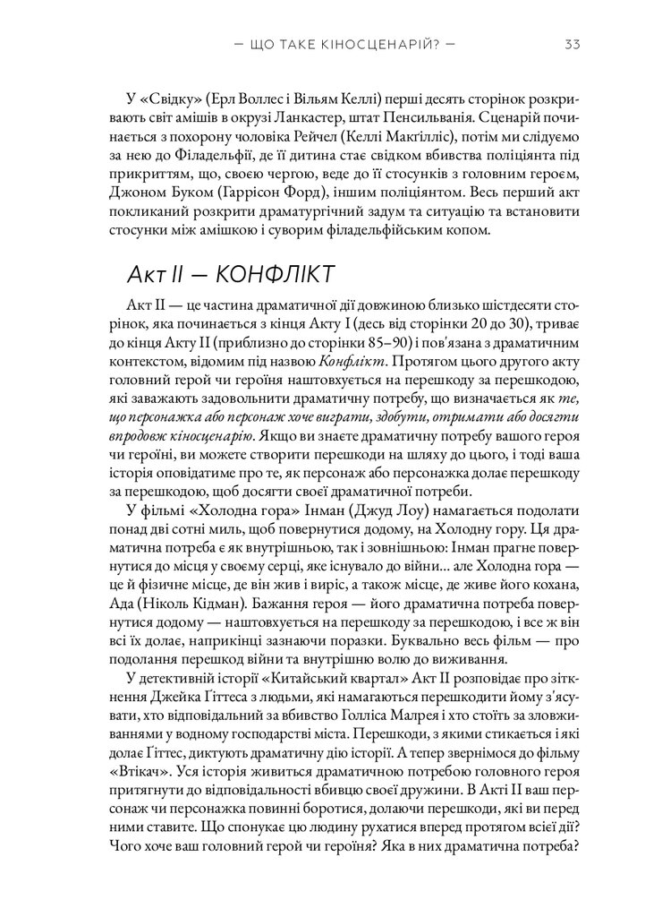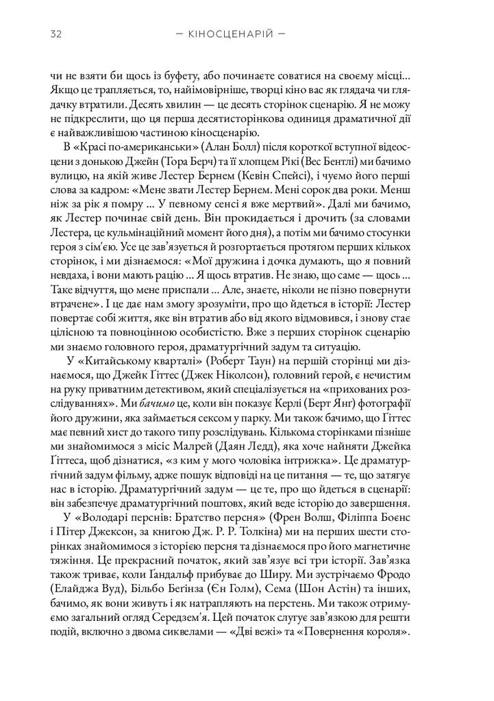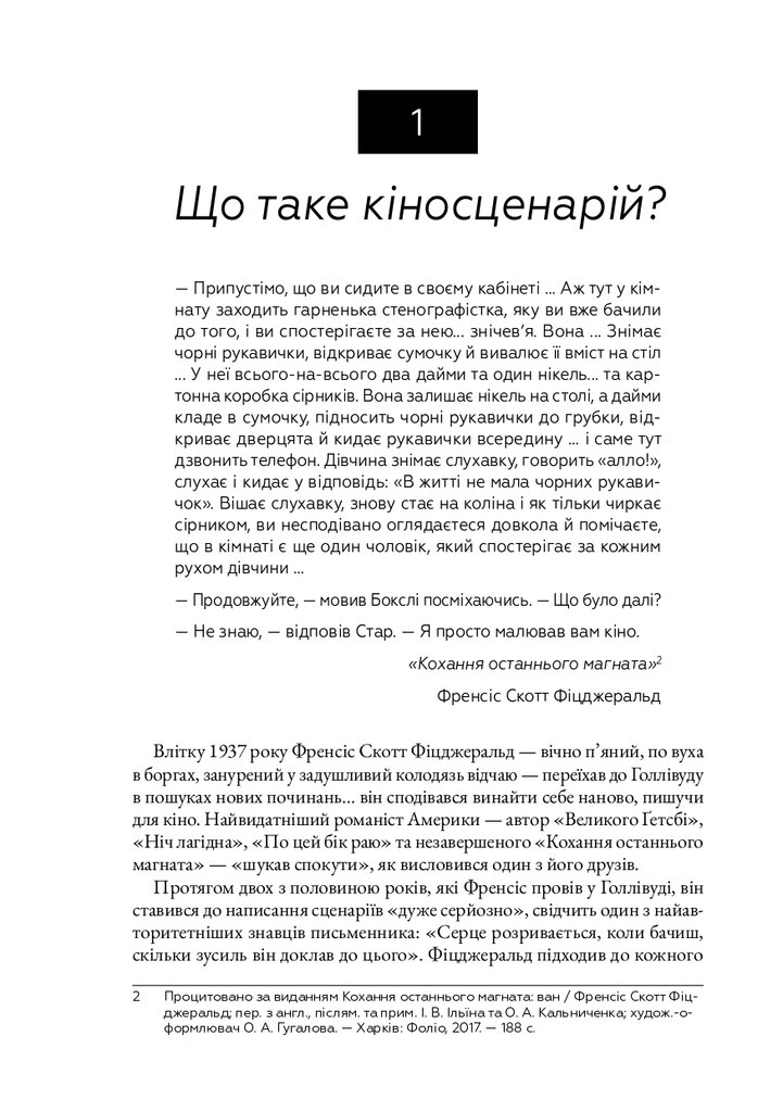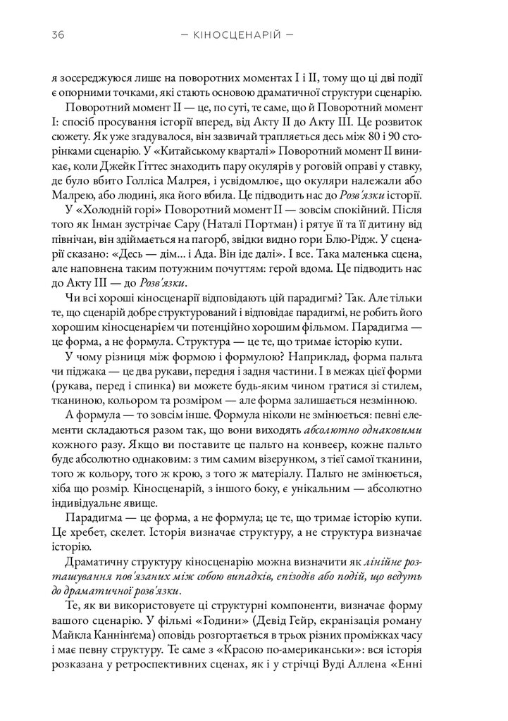 Книга «Кіносценарій» відомого американського теоретика Сіда Філда є класичним посібником для всіх, хто прагне опанувати мистецтво написання сценаріїв. Автор систематизує основні принципи побудови драматургії, пояснює структуру сценарію — від експозиції до кульмінації та розв’язки — і докладно розглядає триактну модель, яка стала стандартом у світовій кіноіндустрії. На численних прикладах із відомих фільмів Філд демонструє, як створювати переконливих персонажів, динамічний сюжет і драматичну напругу.