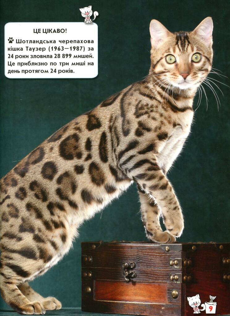 Сьогодні, за різними підрахунками, у світі налічується від 100 до 700 порід кішок. Інформацію про найвідоміших із них подано в цій енциклопедії. Вона містить короткий опис вусатих улюбленців, включаючи їхні звички. На сторінках видання ви знайдете цікаві факти про життя кішок і дізнаєтеся про рекорди, поставлені цими дивовижними тваринами. А розміщені в книжці яскраві фотоілюстрації допоможуть скласти уявлення про зовнішній вигляд і вдачу вусатих мурчиків. Книжку адресовано допитливим дівчаткам і хлопчикам, а також їхнім турботливим батькам.