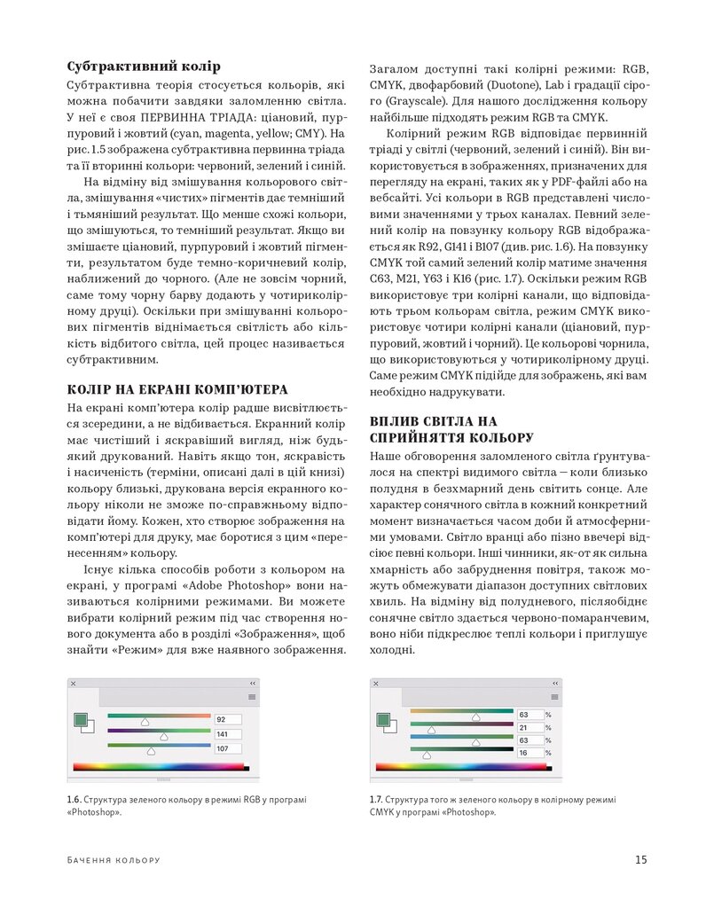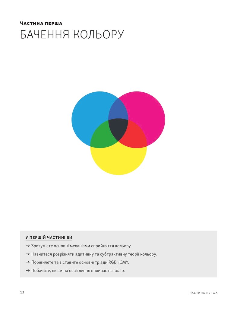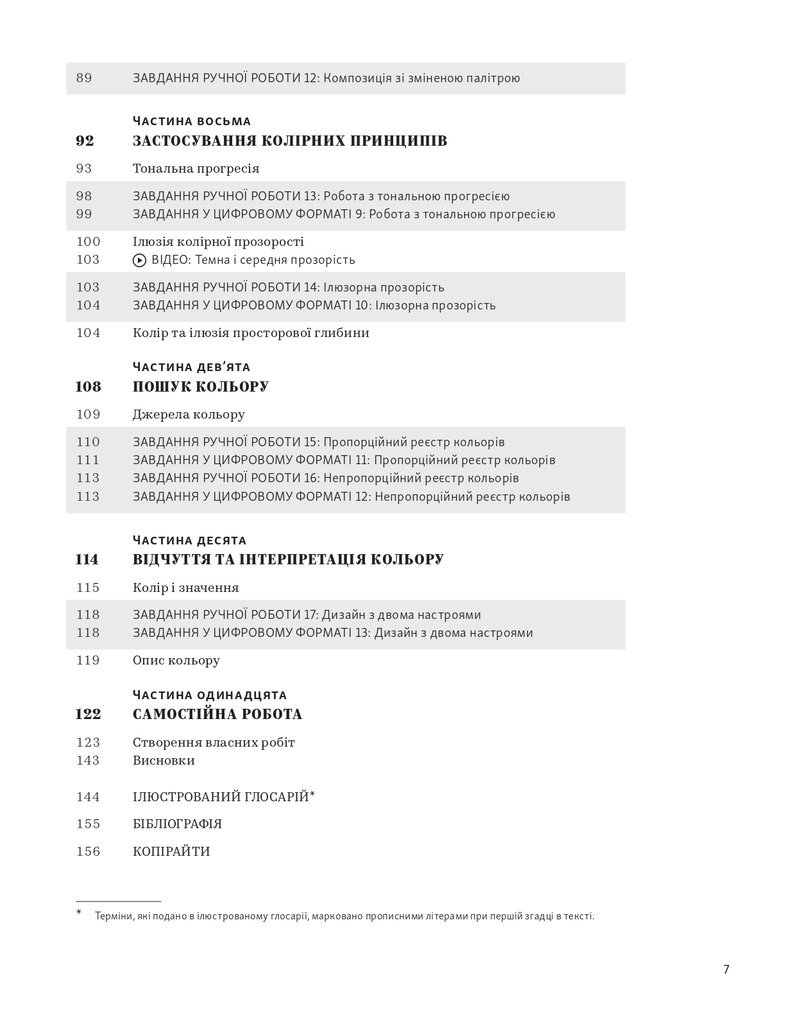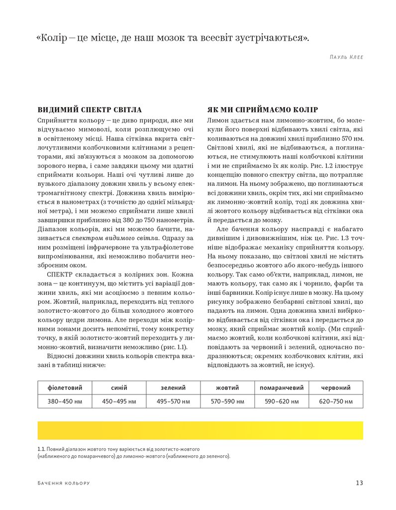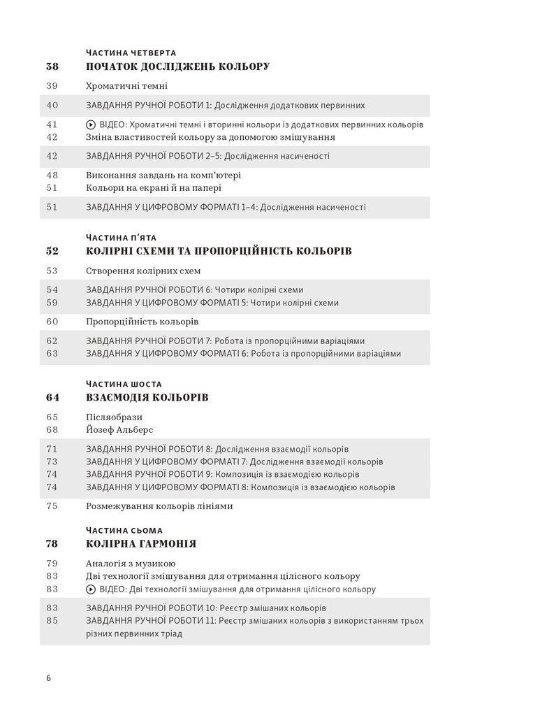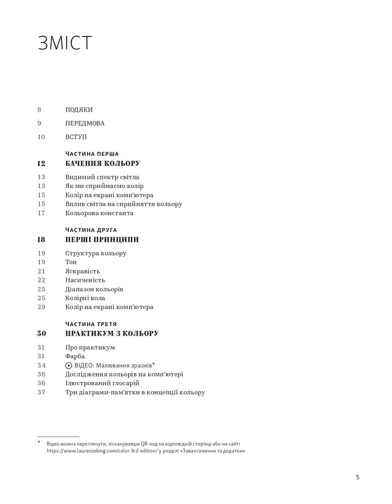 Посібник пропонує багато цікавих пояснень теорії кольору, поєднання кольорів, тонкощів сприйняття і чимало цікавих практичних завдань для вироблення практичних навичок. Видання супроводжується численними ілюстраціями поєднання кольорів, роботами митців й тих, хто практикував цей курс.
