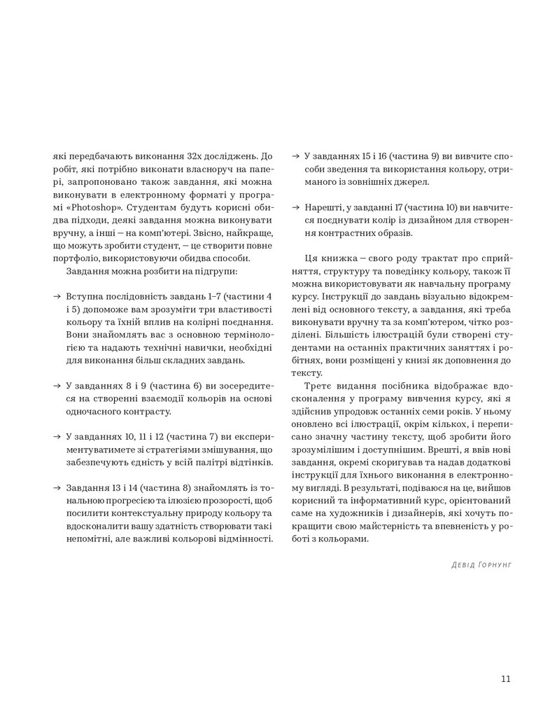 Книга «Колір: Практикум для художників та дизайнерів» Девіда Горнунга - чудовий практикум для тих, хто прагне дослідити тонкощі роботи з кольором, експериментувати й знати базові правила. Адресована художникам, дизайнерам й іншим митцям, книжка може зацікавити й тих, хто лише навчається працювати з кольором, хоче освоїти тонкощі змішування барв на папері й у комп’ютерній графіці.
