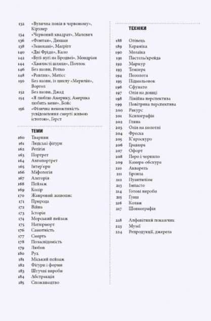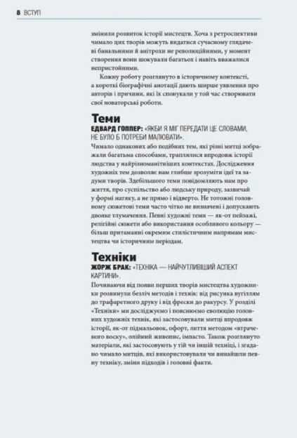 Завдяки цьому кишеньковому пораднику ви зможете відстежити розвиток мистецтва від найдавніших часів, дізнатися про найвидатніших представників культурних епох і мистецьких рухів та переглянути їхні найвідоміші роботи. Кожну із них розглянуто в історичному контексті, а короткі біографічні анотації дають ширше уявлення про авторів і першоджерела їхньої творчості.