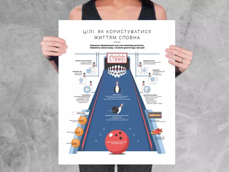 Комплект коуч-плакатів включає 10 інфографік, що візуалізують шлях до мети.
