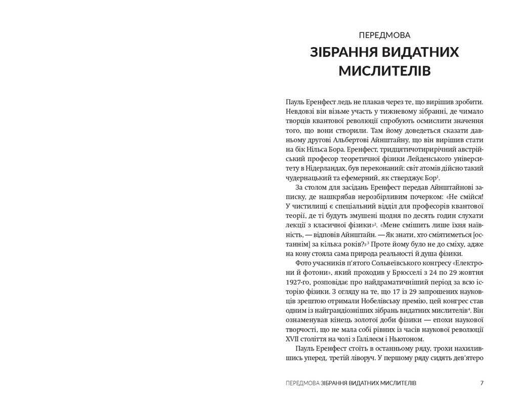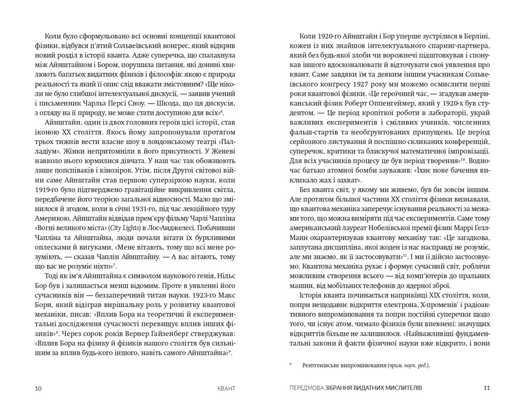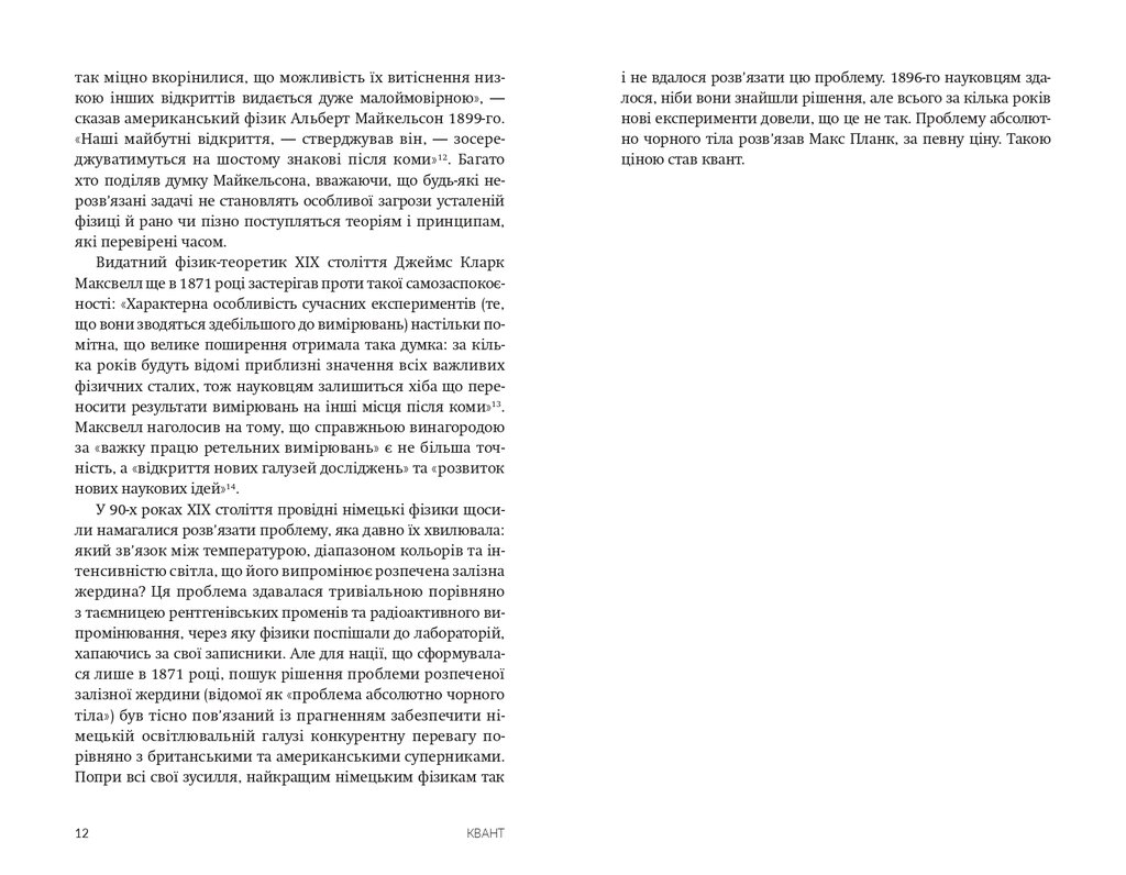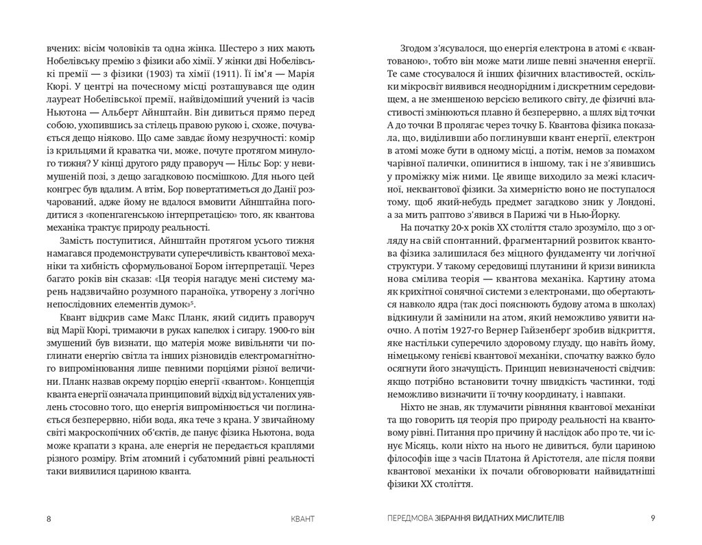 «Квант» — книжка передусім історична, щось на кшталт колективної біографії найвидатніших фізиків першої половини XX століття. То були дивовижні часи: все почалося зі спроб створити ефективнішу лампочку, а закінчилося крахом класичної науки. Кумар описує, як, на перший погляд, незначущі аномалії призвели до появи нової фізики і як найбільші уми світу намагалися дати раду тму, що квантова теорія, здавалося, заперечує існування реальності. Двоє з тих великих умів — Айнштайн і Бор — цілковито розійшлися в інтерпретації квантової революції, і їхня незгода вилилась у глибоку філософську дискусію про те, яким є наш світ на найфундаментальнішому рівні. Уникаючи рівнянь і плутаних пояснень, Кумар розкриває суть цих запеклих дебатів. Його праця заслужено вважається однією з найкращих історичних книжок про розвиток науки.