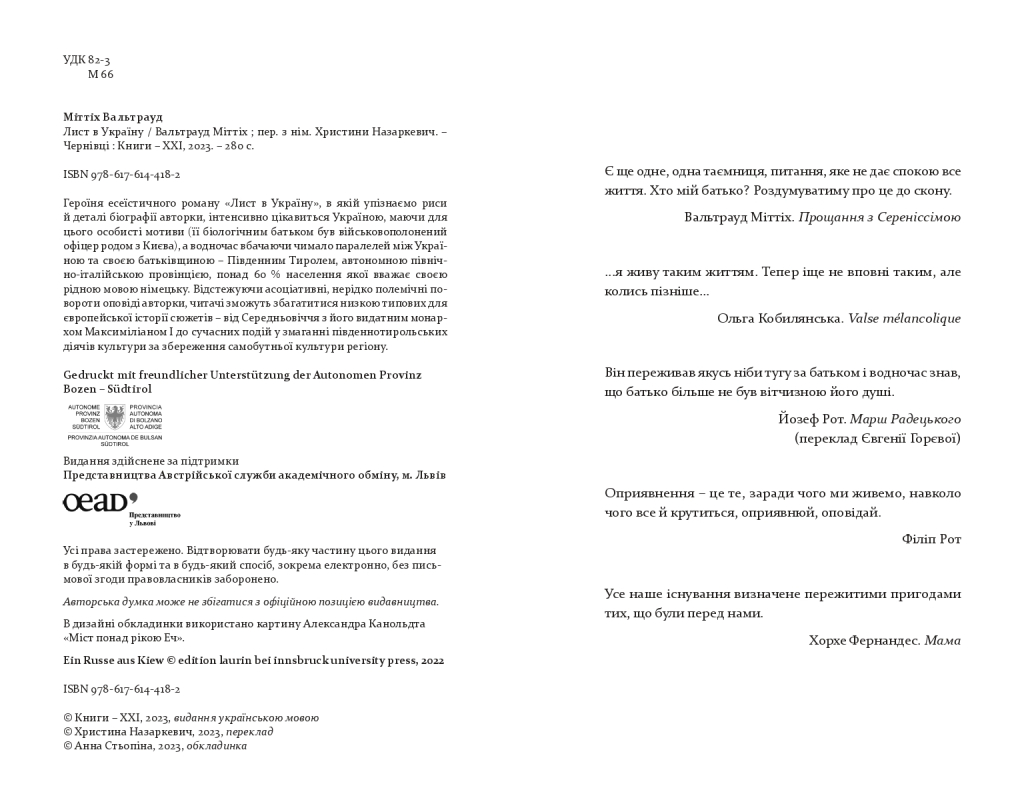 Героіня есеістичного роману «Лист в Украіну», в якіи упізнаємо риси и деталі біографіі авторки, інтенсивно цікавиться Украіною, маючи для цього особисті мотиви (іі біологічним батьком був віиськовополонении офіцер родом з Києва), а водночас вбачаючи чимало паралелеи між Украіною та своєю батьківщиною – Південним Тиролем, автономною північно-італіиською провінцією, понад 60 % населення якоі вважає своєю рідною мовою німецьку. Відстежуючи асоціативні, нерідко полемічні повороти оповіді авторки, читачі зможуть збагатитися низкою типових для європеиськоі історіі сюжетів – від Середньовіччя з иого видатним монархом Максиміліаном І до сучасних подіи у змаганні південнотирольських діячів культури за збереження самобутньоі культури регіону.