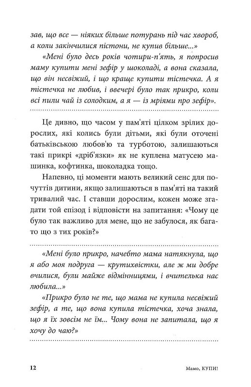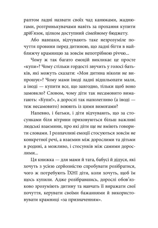 Дитина, яка тупоче ніжками біля прилавка і вимагає: «Купи!» ні в кого з дорослих не викликає подиву. Ця картинка давно знайома більшості мам і тат, бабусь і дідусів. Нова книга Анни Кравцової допоможе розв'язати проблему, з якою зіштовхуються майже всі батьки.