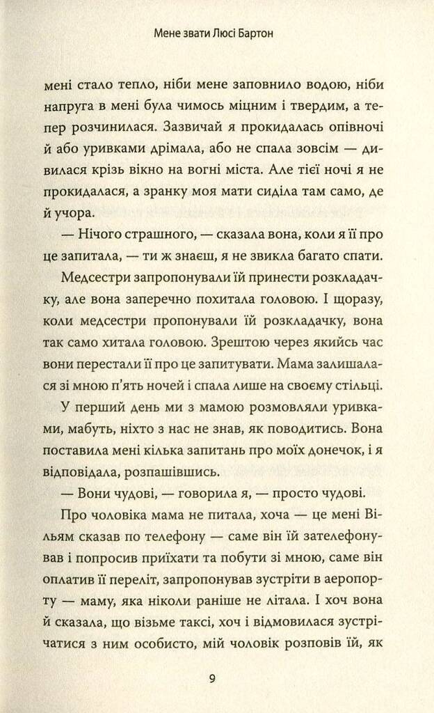 Після нескладної операції лікарі не квапляться виписувати Люсі Бартон, адже її організм відмовляється видужувати. Причини хвороби Люсі невідомі, однак саме через ці ускладнення до неї приїжджає мама, з котрою героїня не спілкувалася впродовж багатьох років. Це історія життя людини, котра зазнала чимало лиха в дитинстві, та не зламалася.