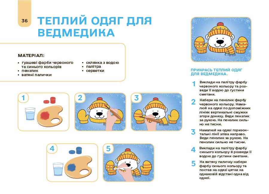 Відповідно до програми розвитку дітей 3–4 років дібрано теми для малювання різними засобами: гуашевими фарбами, кольоровими олівцями. Передбачено маклювання традиційними й нетрадиційними техніками (зубною щіткою, ватяними паличками, трубочками для коктейлю, пальчиками, відбитками природного матеріалу та іншими).